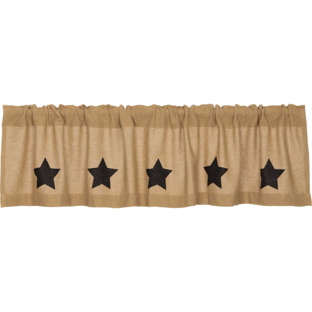 Add a little rustic charm to your home with window decor that is small in size, but big on texture and style. The Burlap Black Stencil Stars Valance measured 16x72 inches and features a warm, natural tan base in a soft cotton burlap. Paired with panels or swags on larger windows, this valance covers curtain rods and keeps the decorative element intact with country barn stars. Includes a generous 3.25 inch rod pocket for easy hanging with a variety of hardware.