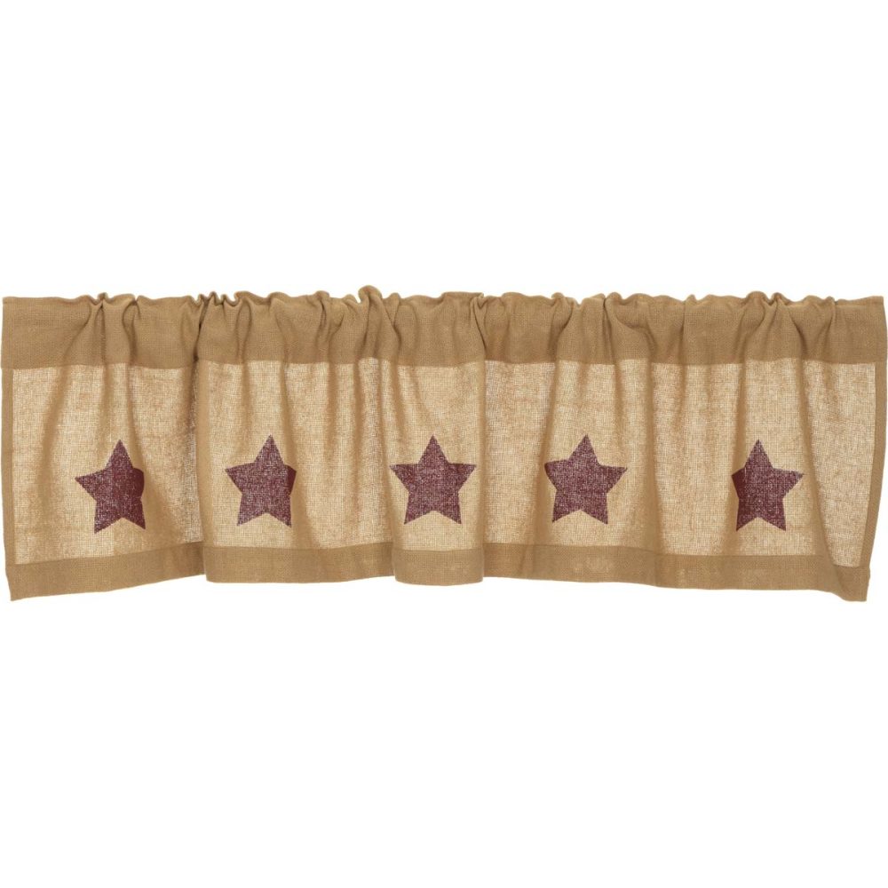 Add a little rustic charm to your home with window decor that is small in size, but big on texture and style. The Burlap Burgundy Stencil Stars Valance measured 16x72 inches and features a warm, natural tan base in a soft cotton burlap. Paired with panels or swags on larger windows, this valance covers curtain rods and keeps the decorative element intact with country barn stars. Includes a generous 3.25 inch rod pocket for easy hanging with a variety of hardware.