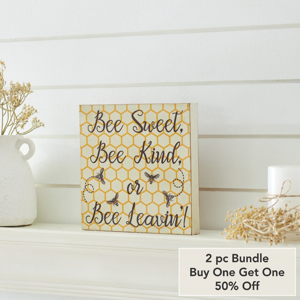 - Sku – 88528 – Buzzy Bees Bee Sweet, Bee Kind, or Bee Leavin! MDF Block Sign 8x8x1 (2 Packages)