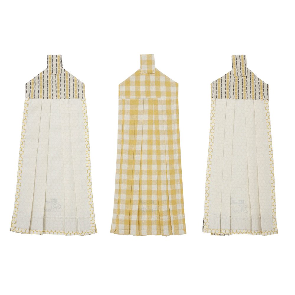 - Elevate your kitchen and bathroom decor with the VHC Brands Cotton Buzzy Bees Button Loop Kitchen Towel Set of 3. These 21×7-inch Hanging Kitchen Towels feature a Vintage, distressed appearance with charming honeycomb and checks base with designs like “Bee Kind,” “Grateful,” and “Blessed.”