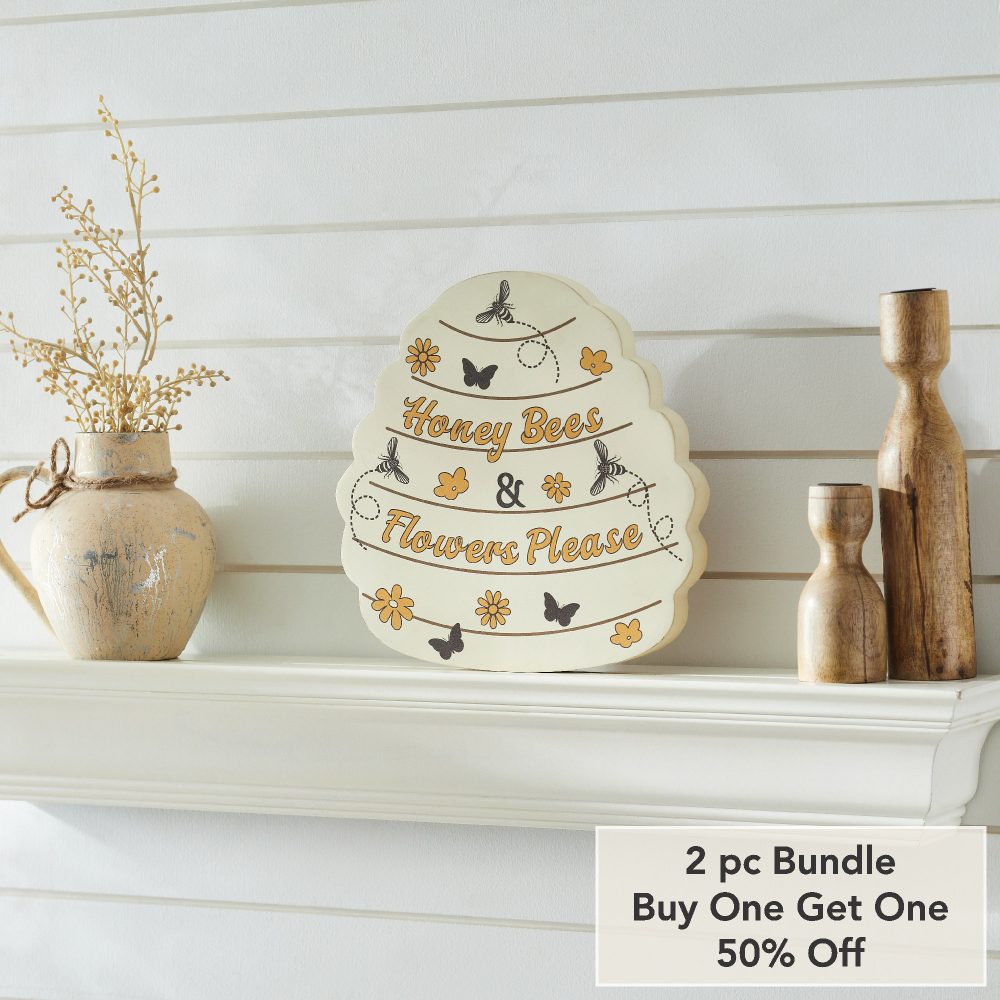 - Sku – 88533 – Buzzy Bees Honey Bees & Flower Please Bee Hive MDF Wall Sign 11x11x1 (2 Packages)