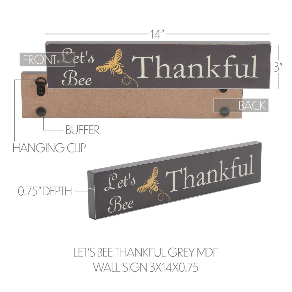 Brighten up your spring decor with the VHC Brands Buzzy Bees "Let's Bee Thankful" Grey MDF Wall Sign. Measuring 3x14 inches, this charming sign features the uplifting phrase "Let's Bee Thankful" rendered in antique white against a distressed storm grey background. The design is accented by a cheerful yellow honey bee, adding a touch of warmth and whimsy to your space. Crafted from durable MDF, this wall sign combines rustic farmhouse appeal with a modern digital print. The soft yellow, storm grey, and antique white color palette creates a soothing and inviting atmosphere, making it a versatile addition to various rooms in your home. Its distressed appearance enhances its vintage charm, perfectly suited for a cozy, country-inspired decor. Easy to maintain with a simple wipe clean, this sign is ideal for any room, including bathrooms, bedrooms, dining rooms, entryways, kitchens, and living rooms. Embrace the spirit of gratitude this spring with a sign that not only decorates but also inspires kindness and thankfulness in your everyday life.