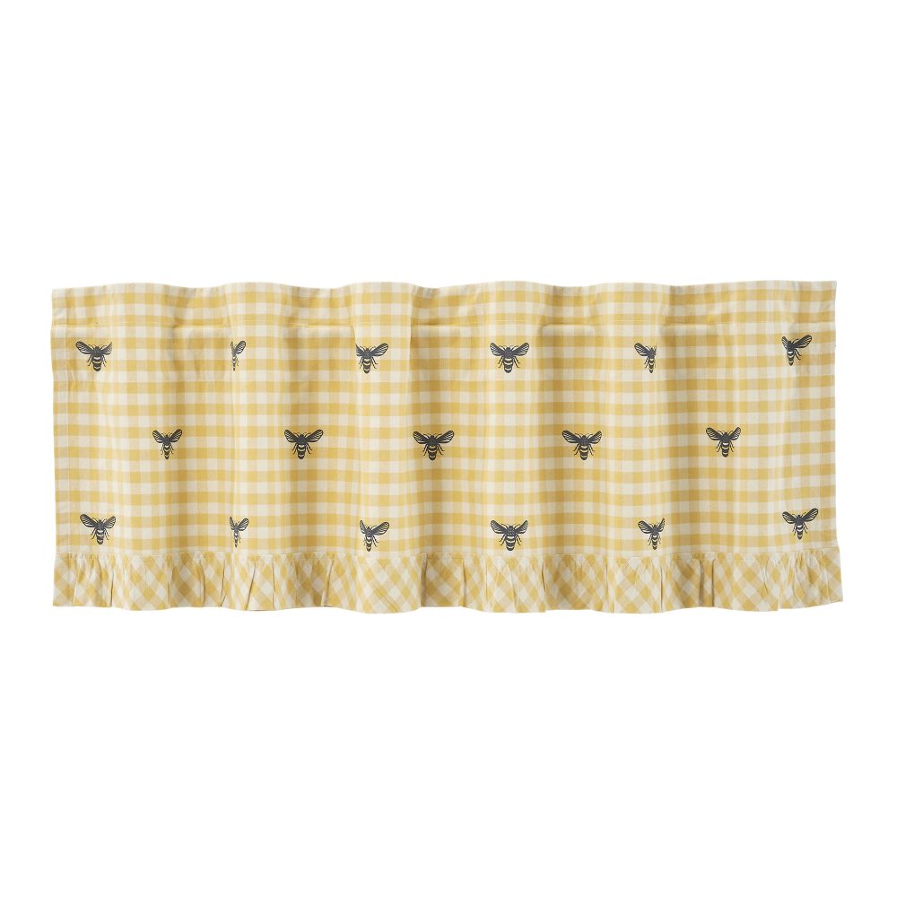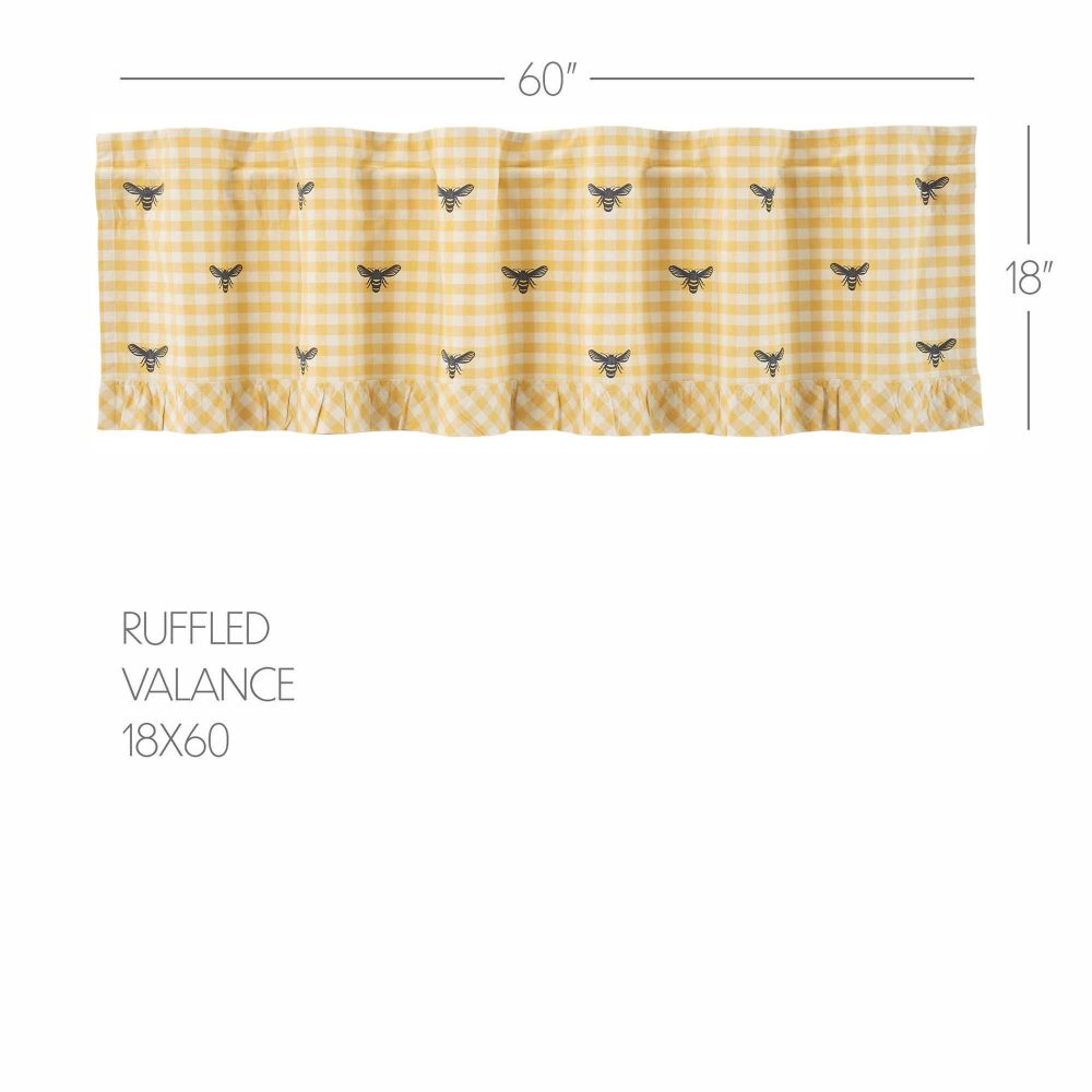 Introducing the VHC Brands Buzzy Bees Ruffled Valance, a delightful addition to your primitive and vintage-inspired decor. This lined 18x60-inch window treatment adds a touch of nostalgia to your bedroom, living room, dining room, or kitchen. Made from high-quality cotton in a charming vintage yellow with a classic checkered pattern and bees from the Buzzy Bees Collection. Crafted with precision, the ruffled design adds a touch of classic charm to your windows, creating a warm and inviting atmosphere. The flat weave cotton ensures durability and easy maintenance, making it a practical choice for any room in your home. Elevate your interior with this valance, showcasing the perfect blend of style and functionality for a cozy, timeless ambiance that captures the essence of vintage living.