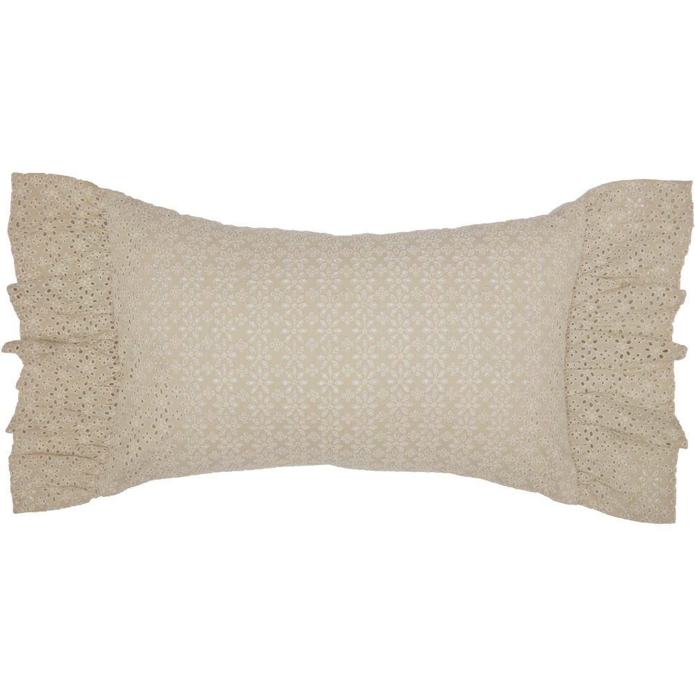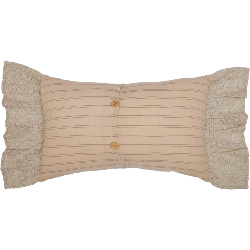Romantic ruffles in warm, vintage tones create a chic cottage accent piece that adds elegance to any cozy chair or humble welcome bench. The Camilia Eyelet Pillow measures 14x22 inches and includes a wide ruffled edge and front in a detailed soft tan floral eyelet design. The romantic, ruffled accent pillow reverses to a soft, vintage-inspired stripe with button-style closures. Constructed from 100 percent cotton with a polyester fill. Coordinates with the Camilia Collection from VHC for accent and foundational pieces in a romantic vintage farmhouse style with the quality you would expect from over 20 years of satisfied customers.