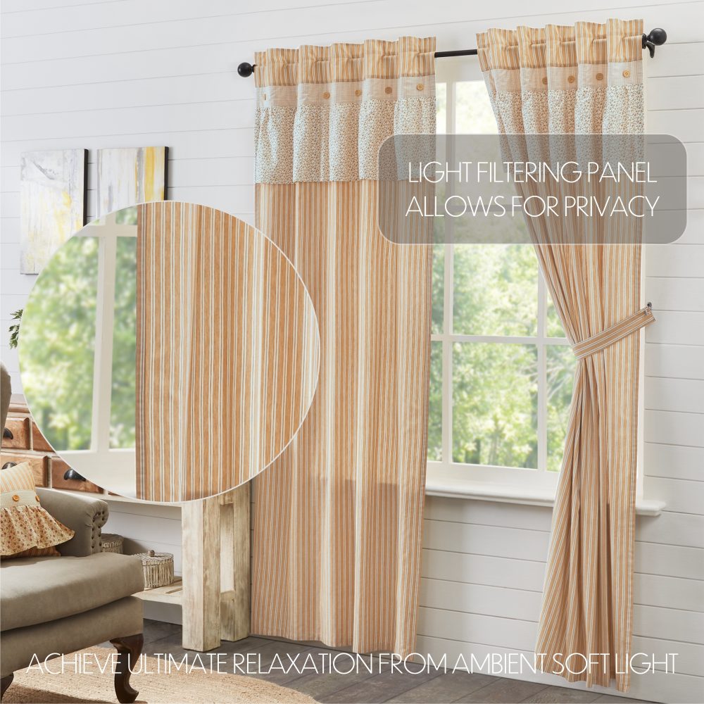 Bring the quaint vision of country life and simpler times to life with our Camilia Ruffled Panel Set of 2 84x40. This gold and creme stripe curtain set is beautifully decorated with a graceful ruffle and wooden buttons adding rustic romance and heartwarming, cozy cottage vibes to your window. Includes two matching tie-backs for a quick style change.