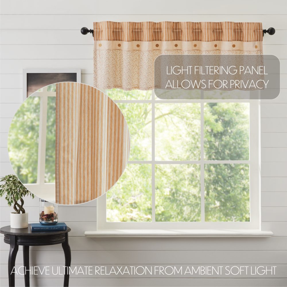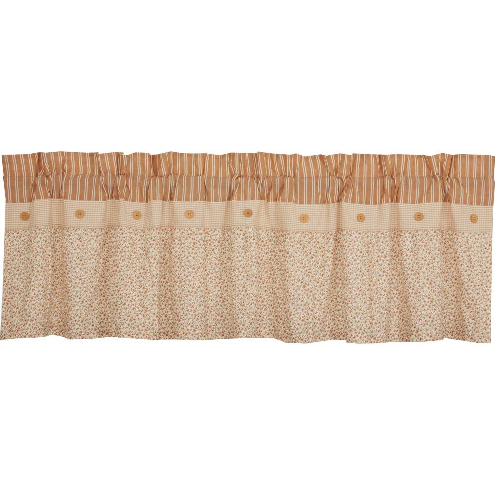 Fill your home with vintage cottage charm. The Camilia Ruffled Valance 19x72 creates a warm country feel with gold and creme striping and a classic ditsy floral print in coordinating tones. The two patterns are divided by a soft plaid stripe with wood button detailing for added interest. This valance is sure to add just the right touch to your home.