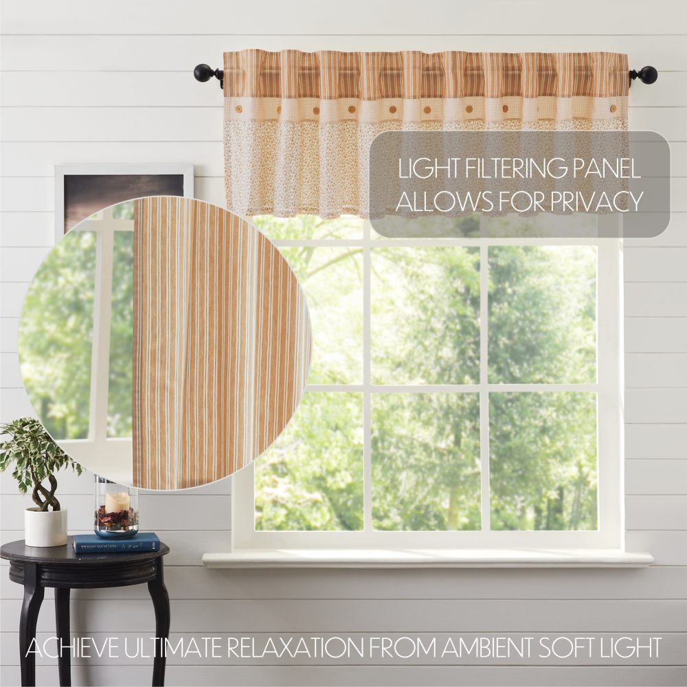 Bring the quaint vision of country life and simpler times to life with our Camilia Ruffled Valance 19x90. This gold and creme stripe curtain set is beautifully decorated with a graceful ruffle and wooden buttons adding rustic romance and heartwarming, cozy cottage vibes to your window.