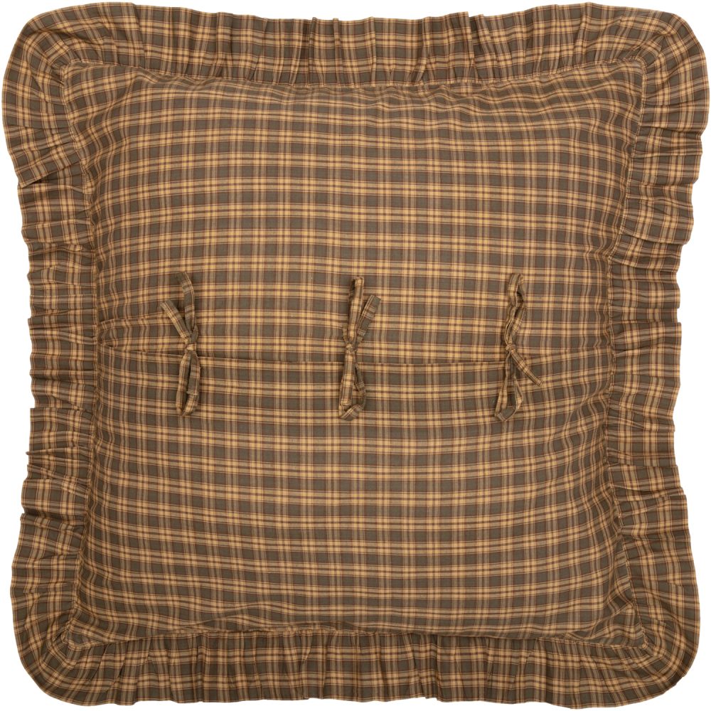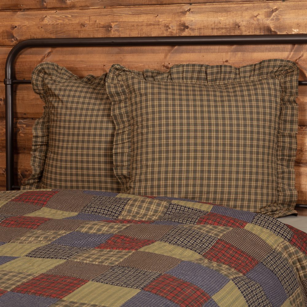 Embrace the colors of nature and rustic country decor with rich tones of olive green and dark brown with tan accents. The Cedar Ridge Euro Sham measures 26x26 inches and features a traditional tartan plaid pattern with a muted, relaxed feel. Add it to bedding, couches or chairs for warmth and style that transforms your space with a relaxed, timeless country look. Machine washable and iron safe. Includes button-style closures for easy removal and a wide, ruffled edge for classic country style. Does not include fill pillow.