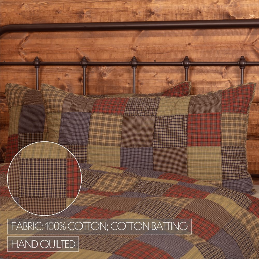 Bring a bit of nature to your bedding and rest easy in a forest-inspired palette of olive greens, deep red, black and navy blue. The Cedar Ridge King Sham includes one 21x37 sham pillow cover featuring a rich mix of plaid and checked patterns in traditional square blocks for a simple, yet sophisticated patchwork. The decorative pillow case reverses to a deep green and tan plaid backing with tie closures to hold your fill pillow (not included) in securely. Machine washable and iron safe.