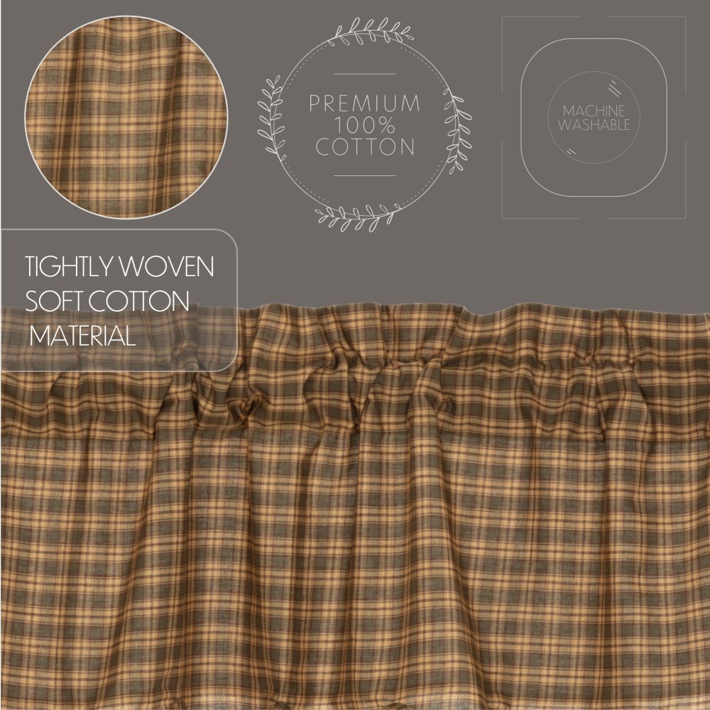 Decorate your windows with a touch of muted, rustic country style with this charmingly designed and thoughtfully crafted window swag set. Displaying a timeless country look with a calming, classic tartan plaid in cedar green, natural tan and dark brown with scalloped edging, the Cedar Ridge Scalloped Prairie Swag Set 36x36x18 enhances your home decor with a modern country feel. The gracefully angled drapes perfectly frame windows providing a bit of polish for your home. Our fully lined prairie swag panels come with built in drawstrings to adjust each panel to meet your style needs, along with a curtain rod pocket for easy hanging. Includes two matching panels for a perfectly dressed kitchen or living room window.