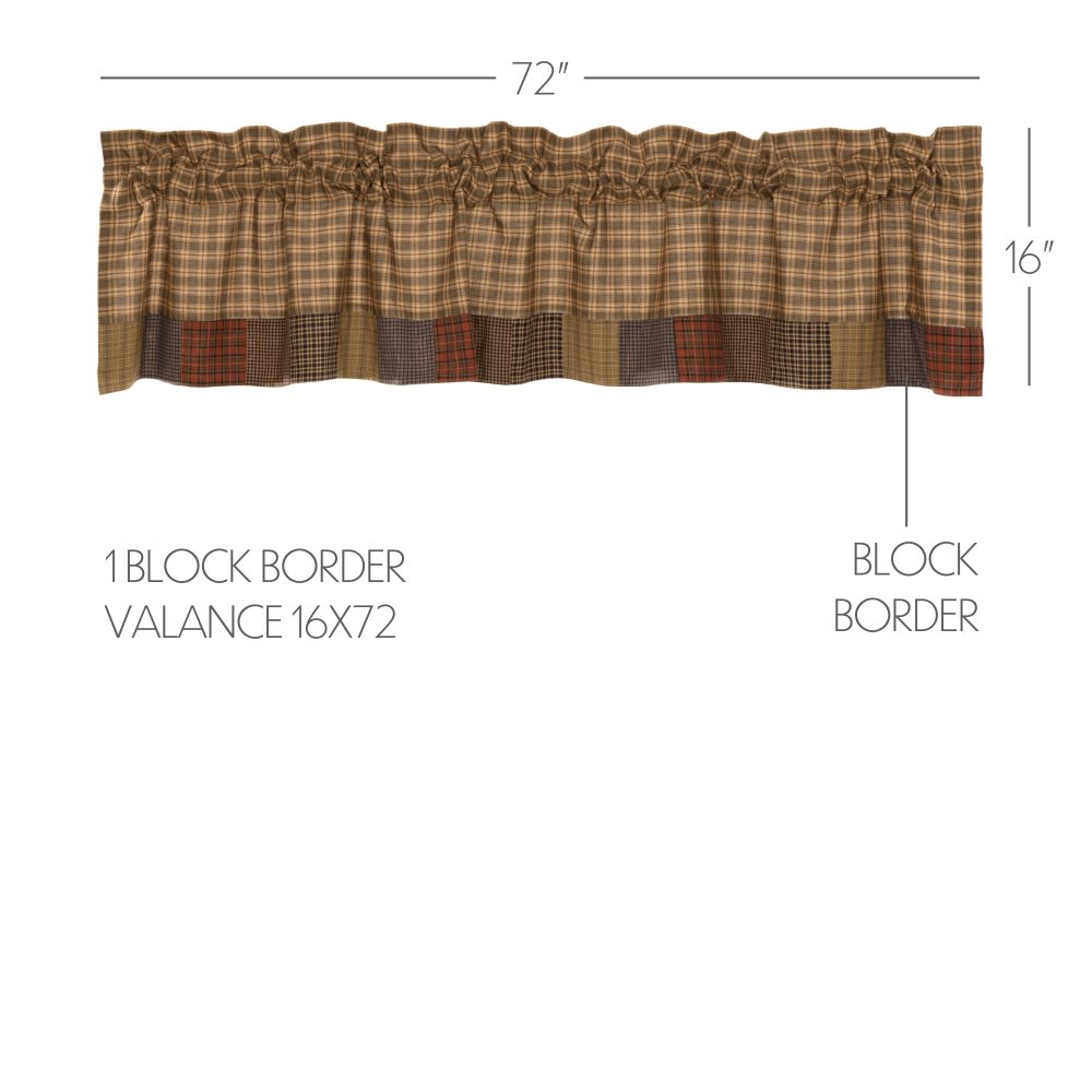 Add a cozy country accent to your windows with warm, nature-inspired tones and bold patchwork. The Cedar Ridge Block Border Valance measures 16x72 inches and offers rich shades of cedar green, brick red and navy blue that blend together in vintage plaid patterns connected in bold, rectangular blocks. A rod pocket and loops are included for easy hanging.