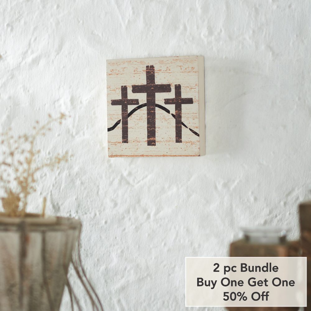 - Sku – 88553 – Celebrate Grace 3 Crosses Distressed Antique White MDF Block Sign 6x6x1 (2 Packages)
