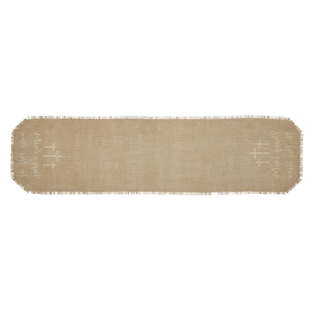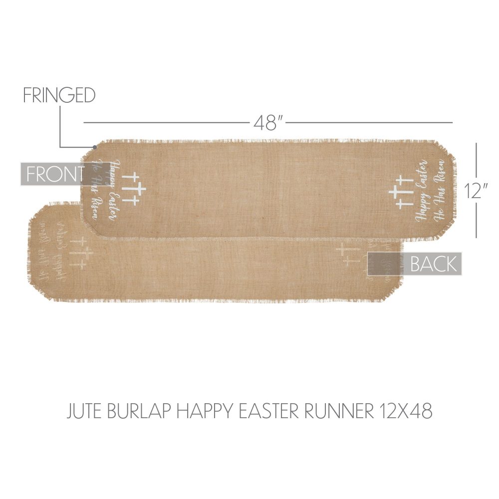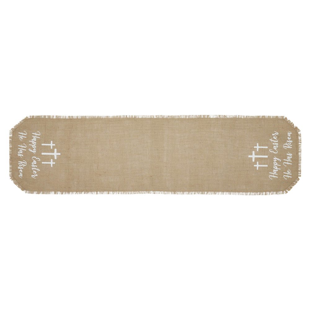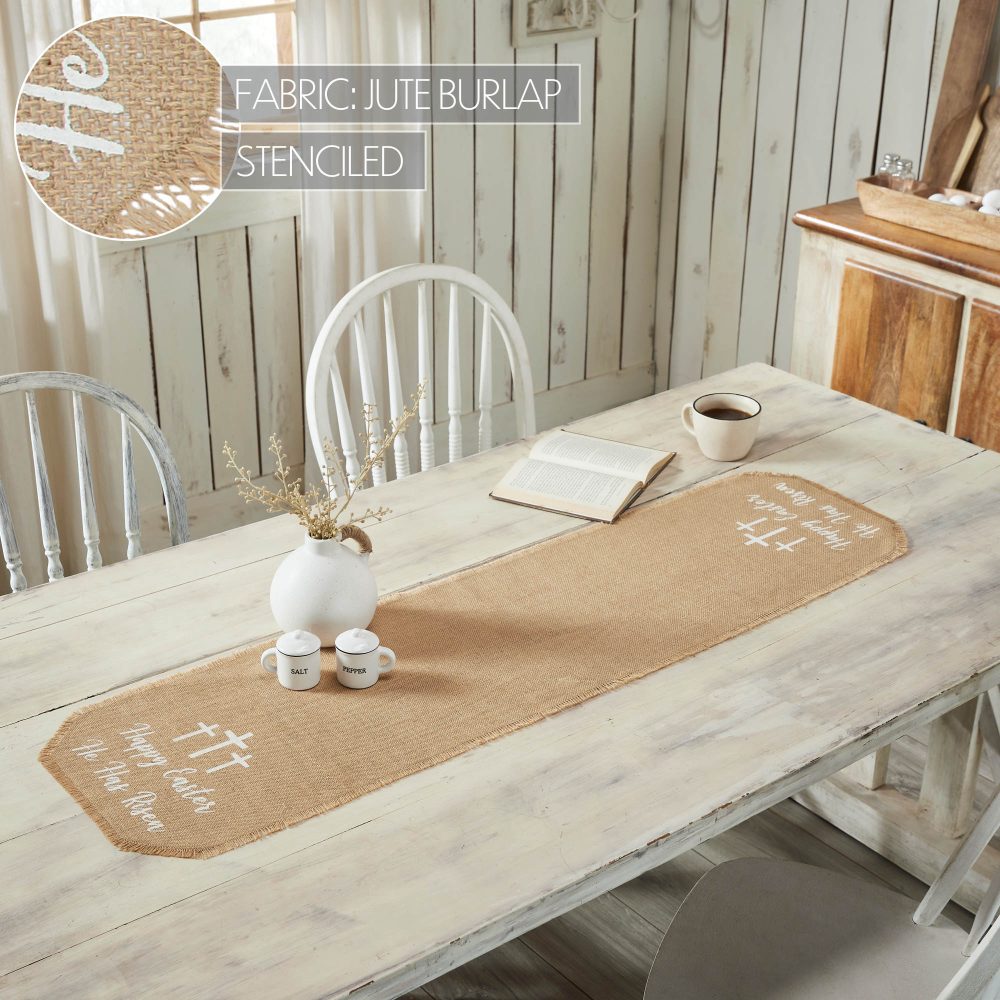 Add a touch of heartfelt tradition to your Easter celebrations with the VHC Brands Celebrate Grace Jute Burlap Happy Easter Runner, measuring an impressive 12x48 inches. This elongated table runner is expertly crafted from jute, a material prized for its durability and rustic appeal. The design features a light tan base accented by stenciled text in light creme that proclaims "Happy Easter He Has Risen," flanked by three simple crosses. The edges of the runner are fringed, enhancing its farmhouse charm and providing a casual yet elegant look that complements any home decor style. Perfect for setting the mood for your spring festivities, this table runner serves as both a decorative and inspirational piece. It fits beautifully across your dining room table, kitchen counter, or even a living room console, offering a versatile decorating option. The natural jute texture and neutral colors make it easy to integrate into various decorating themes, from country to modern minimalist, while still standing out as a focal point of your Easter decor. Maintaining this beautiful Easter runner is as simple as it is elegant; it requires only hand washing to keep it looking its best. This ensures the longevity of the material and the vibrancy of the stenciled message, allowing you to reuse this meaningful piece year after year. Whether you're gathering for a meal, hosting an Easter egg hunt, or simply enjoying the season of renewal, the VHC Brands Celebrate Grace Jute Burlap Happy Easter Runner adds both beauty and a reminder of faith to your home environment.