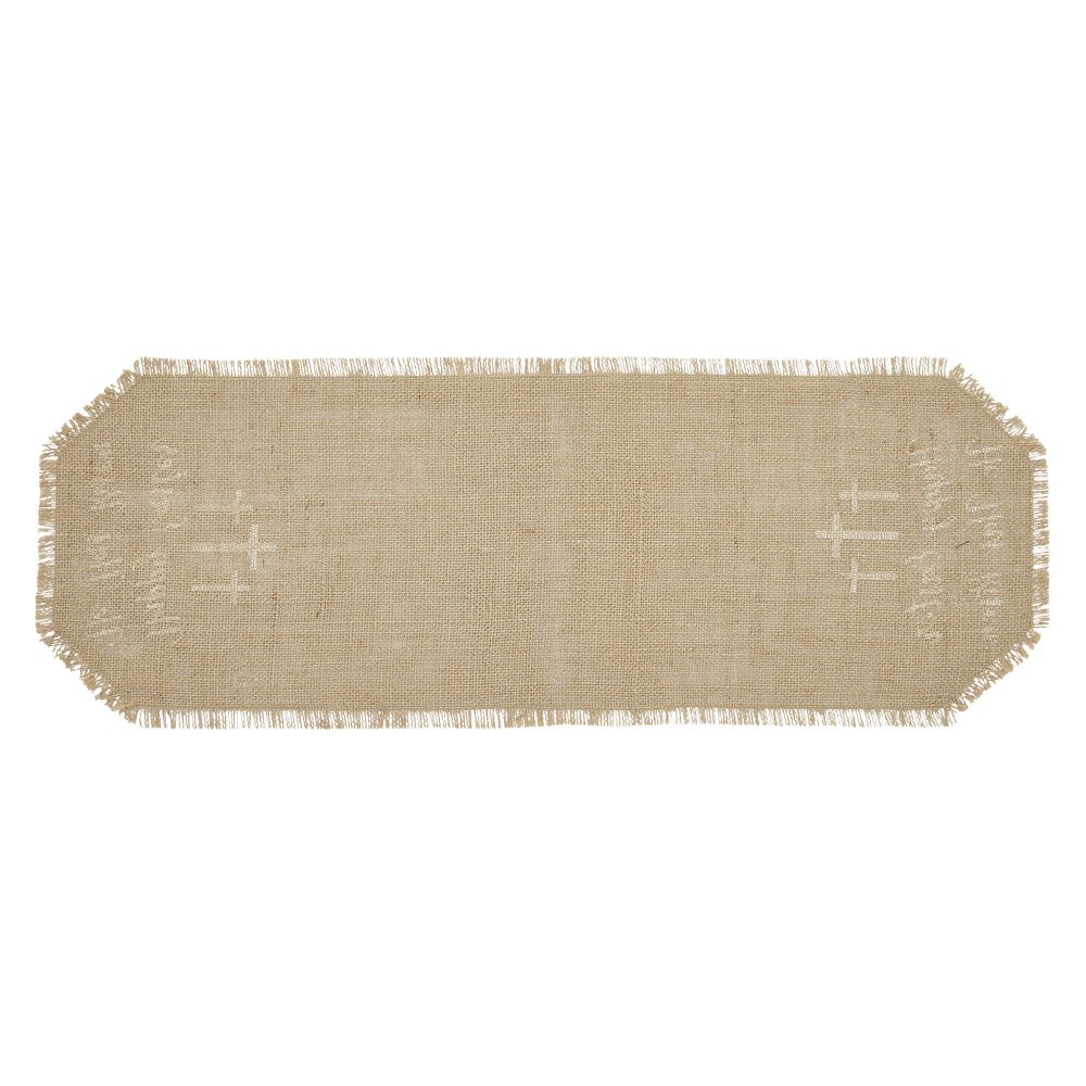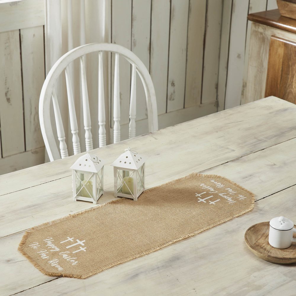 Bring the spirit of Easter into your home with the VHC Brands Celebrate Grace Jute Burlap Happy Easter Runner. Crafted from natural jute, this 8x24 inch table runner embodies the rustic essence of farmhouse and country styles with its light tan base and light creme stenciling. The design features three simple crosses and the inspirational proclamation "Happy Easter He Has Risen," elegantly stenciled to remind guests and family of the season's significance. The runner's edges are tastefully fringed, adding a touch of whimsical charm to its overall appearance, perfect for seasonal spring decor. Designed to blend seamlessly into various home settings, this jute table runner is ideal for placement in the dining room, kitchen, or living room. Its subtle yet powerful message serves as a focal point during Easter celebrations, making it a meaningful addition to your holiday decor. The natural colors and texture of the jute fabric contribute to a warm, inviting atmosphere, enhancing the festive mood and complementing existing decorations. Caring for the VHC Brands Celebrate Grace Jute Burlap Happy Easter Runner is straightforward, requiring only hand washing to maintain its look and integrity. This ensures that each Easter season can be welcomed with a beautiful and enduring table centerpiece that celebrates grace and resurrection. Whether you're hosting a holiday meal or simply decorating for the season, this table runner offers a perfect combination of functionality, style, and spiritual reflection.