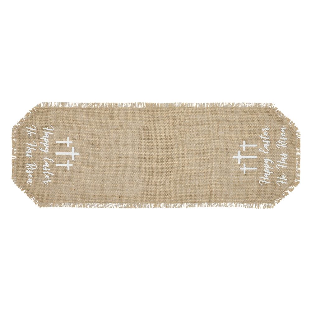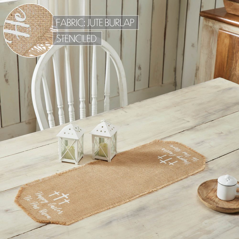 - Easter-Themed Design: Features three simple crosses and the inspirational Christian message “Happy Easter He Has Risen” stenciled in light creme on a light tan jute base, perfect for celebrating the Easter season.