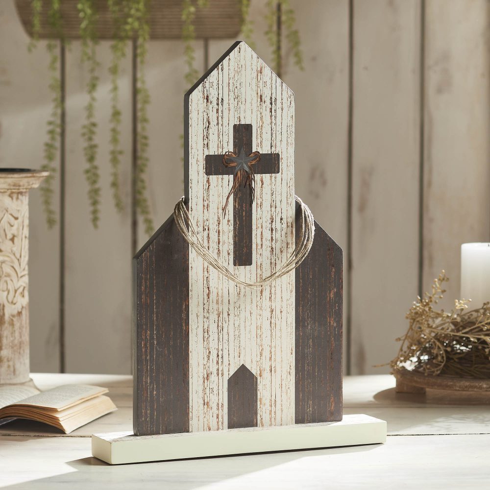 Add a touch of grace and spirituality to your spring and Easter decor with the VHC Brands Celebrate Grace MDF Church. This stunning figurine features a beautifully detailed church crafted in MDF with a distressed white and grey finish. The church is adorned with a grey cross, a faceted star, and a charming bow. An elegant coil made of jute twine is draped over the spire, adding a rustic and heartfelt touch to the design. Measuring 13.75x18.7 inches, this versatile piece makes a meaningful addition to any room in your home. Its classic farmhouse and country aesthetic seamlessly blends into various decor styles, enhancing your bathroom, bedroom, dining room, entryway, kitchen, or living room. The inspirational faith symbol and intricate details make it a standout decoration for both religious and decorative purposes. To keep this lovely church looking its best, simply wipe it clean with a soft cloth. The digital print and distressed appearance lend it a timeless and rustic charm, while the graphic elements ensure it captures the spirit of the season. Embrace the beauty and grace of this elegant piece, and let it inspire and uplift your home throughout the spring and Easter seasons.