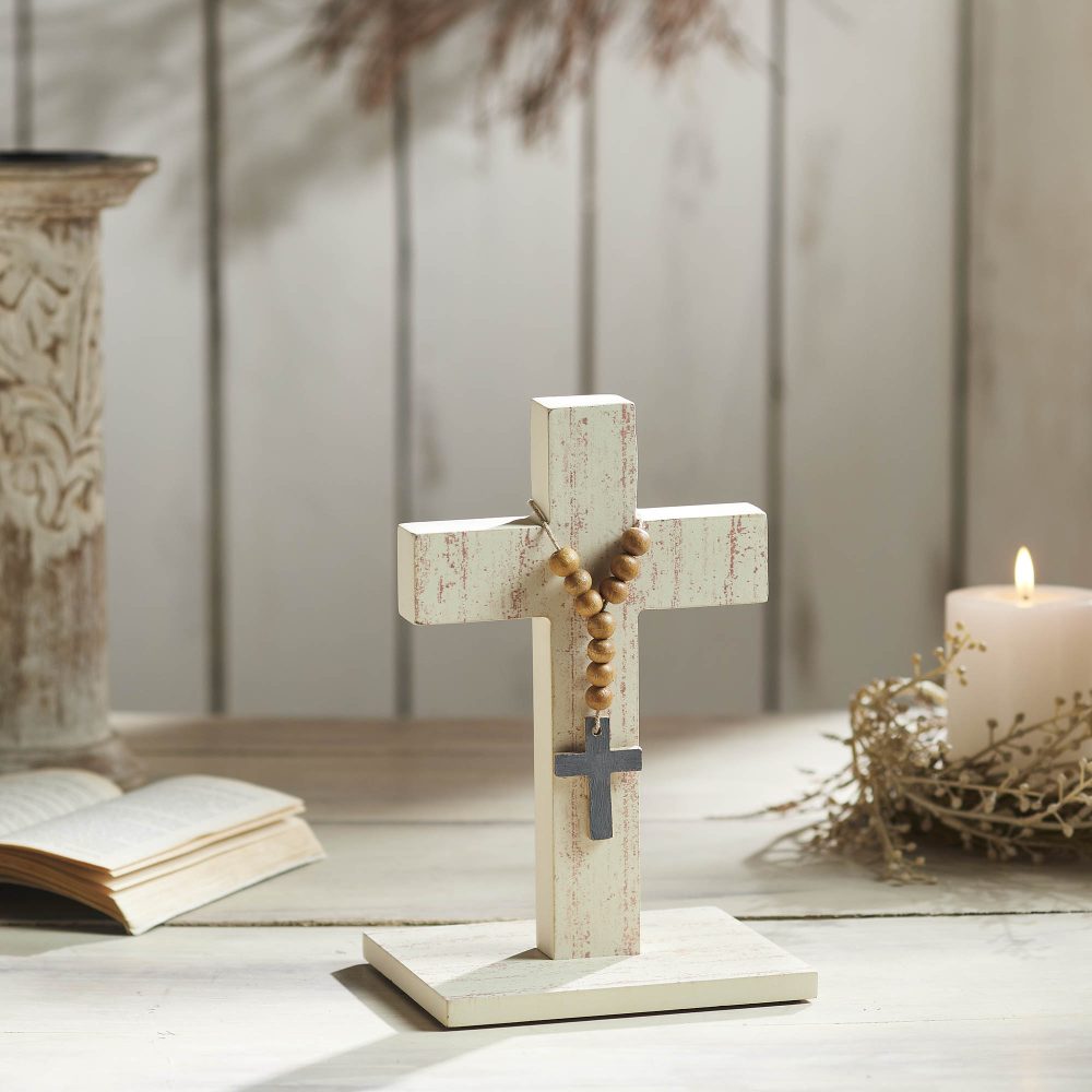 - Inspiring Christian Design: This cross features a classic distressed creme cross adorned with a string of wooden beads and a grey cross ornament draped over the center, symbolizing faith and grace.