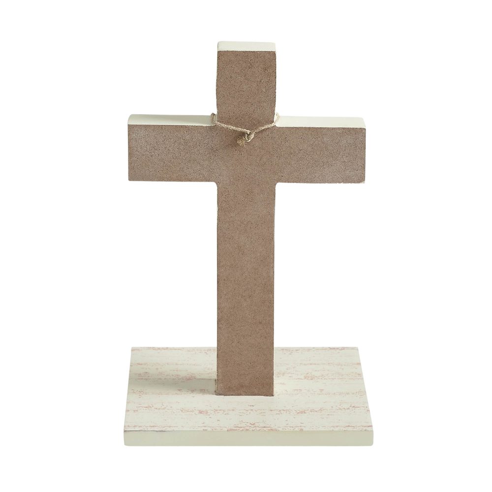 The VHC Brands Celebrate Grace MDF Cross w/ Wooden Bead Ornament is a beautifully crafted piece that brings a serene and spiritual dimension to your Easter and spring decorations. This 6x9.75-inch figurine is made from medium-density fiberboard (MDF), known for its durability and smooth finish. The classic cross shape features a distressed creme finish that provides a rustic yet refined look, suitable for both farmhouse and country decor styles. Adorning the center of the cross is a string of wooden beads in a natural wood brown, paired with a smaller grey cross ornament that adds depth and contrast to the overall design. Perfect for placing in a variety of spaces, this cross on a base can enhance the spiritual ambiance of your home when placed in the bathroom, bedroom, dining room, entryway, kitchen, or living room. Its aged creme, dark grey, and wood brown color palette blends seamlessly with existing decor, offering a subtle yet meaningful touch that complements any setting. The removable ornament comes ready to hang within your home or leave it draped on the cross statue. Maintaining the VHC Brands Celebrate Grace MDF Cross is straightforward and simple. A gentle wipe with a soft cloth is all that's needed to keep it clean, preserving its distressed appearance and vibrant detailing. This easy upkeep ensures that the cross remains a cherished part of your seasonal decor for years to come, symbolizing faith and renewal each Easter. Whether you're decorating for a holiday or seeking a permanent reminder of grace in your home serving as a beautiful expression of faith and decor.
