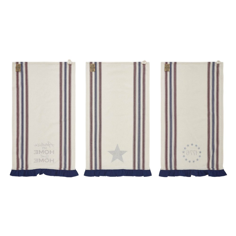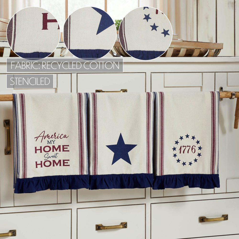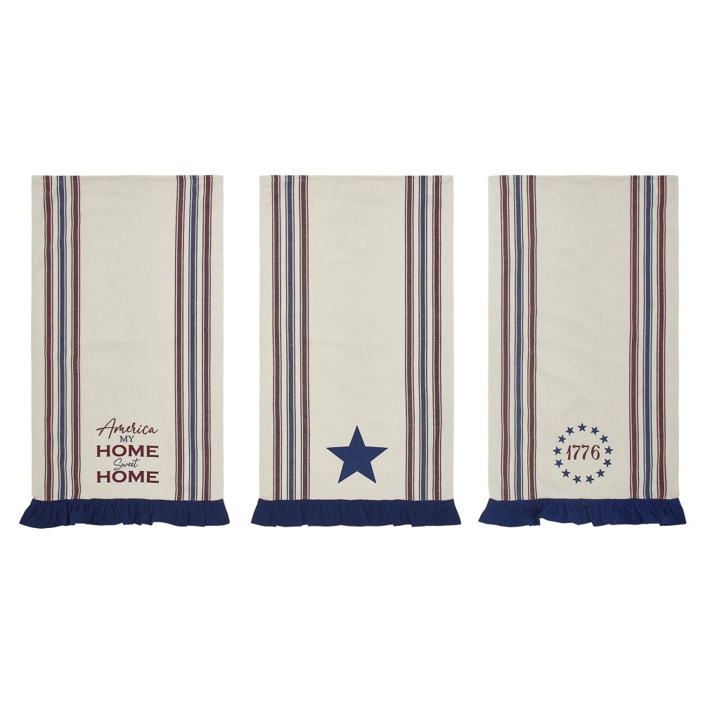 Celebrate the spirit of Independence Day with the VHC Brands Patriotic Celebration America My Sweet Home Ruffled Tea Towel Set of 3 16x28. This delightful set includes three tea towels, each with a unique patriotic design. One towel proudly displays the phrase "America My Home Sweet Home," while another features "1776" encircled by a ring of blue stars. The third towel showcases a bold 5-point blue star. All three designs are printed on an ivory base with red and blue stripes and finished with a 2-inch deep blue ruffle for a charming, decorative touch. These tea towels are both functional and stylish, making them a versatile addition to your kitchen or dining space. Their generous size is perfect for drying dishes, wiping surfaces, or adding a festive accent to your countertops and table settings. The classic ivory, burgundy, and deep blue color palette complements rustic farmhouse and country-style decor, making them ideal for Fourth of July celebrations or year-round displays of patriotic pride. Crafted from high-quality cotton, the VHC Brands Patriotic Celebration Tea Towels are machine washable for easy care, ensuring they maintain their vibrant designs and soft texture through frequent use. Whether used to enhance your holiday gatherings or as a daily nod to your Americana-inspired style, these tea towels combine quality craftsmanship with timeless design. Add warmth, charm, and a touch of patriotic elegance to your home with this beautifully coordinated set.