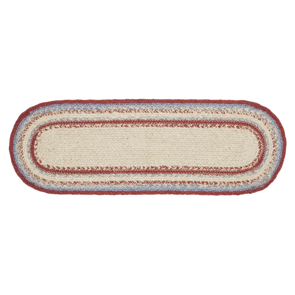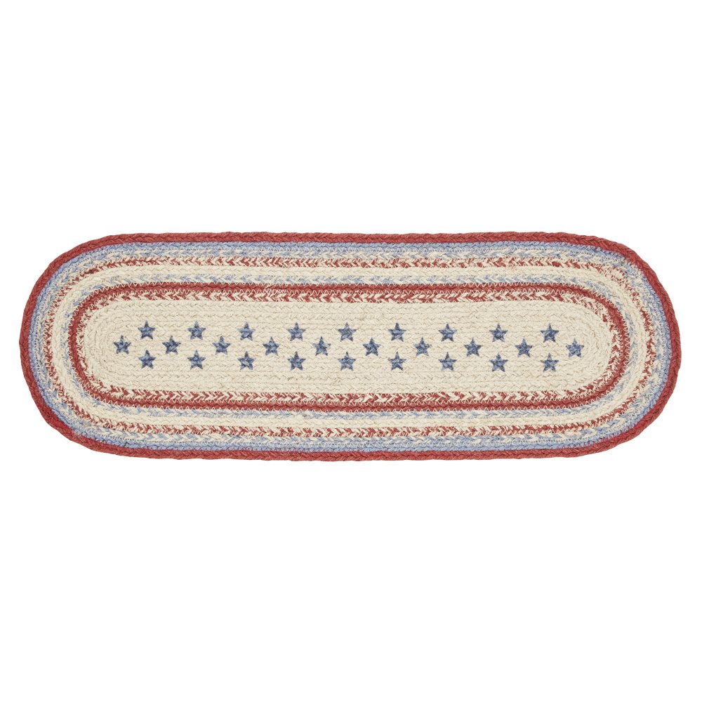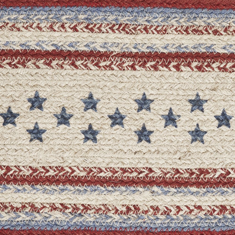 Create a patriotic table for friends and family to gather round and celebrate with crisp red, white and blue braids and classic texture. The Celebration Jute Runner includes one table runner measuring 8x24 inches made from a premium Jute blend. The rich texture of braided jute is given classic American flag style with a white base ringed by rows of stone blue and barn red jute and a central star pattern in blue. Complete your Fourth of July tabletop decor with other pieces from the Celebration Collection by VHC for modern farmhouse style.