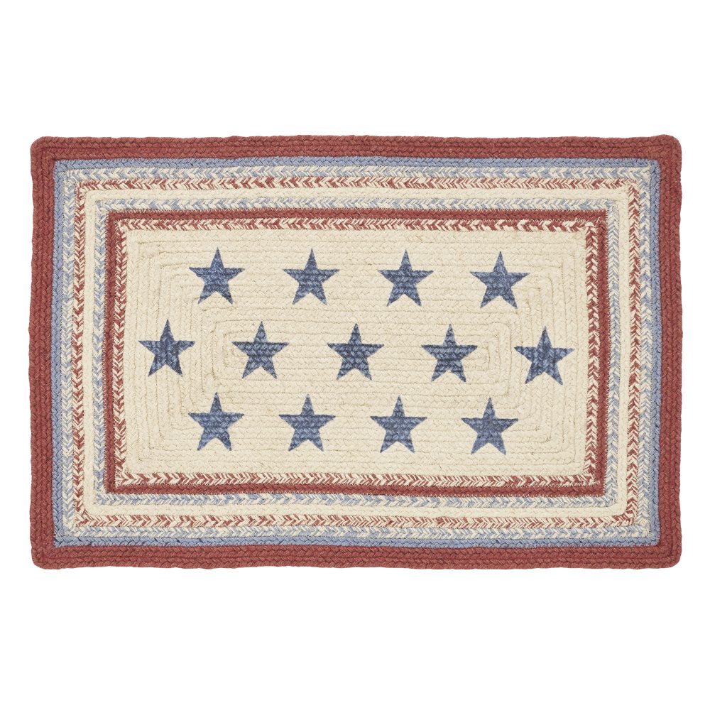 Create a bright, patriotic feeling with red and white stripes and blue stars in a curl-resistant jute blend that adds style and safety anywhere a small accent rug is needed. The Celebration Jute Rug measures 20x30 inches and features a classic rectangle shape and tight braids constructed with a durable jute blend. The special blend relaxes faster and stays flat. Features a blend crisp white, stone blue, and barn red for an Americana look that complements a wide array of country farmhouse decor.