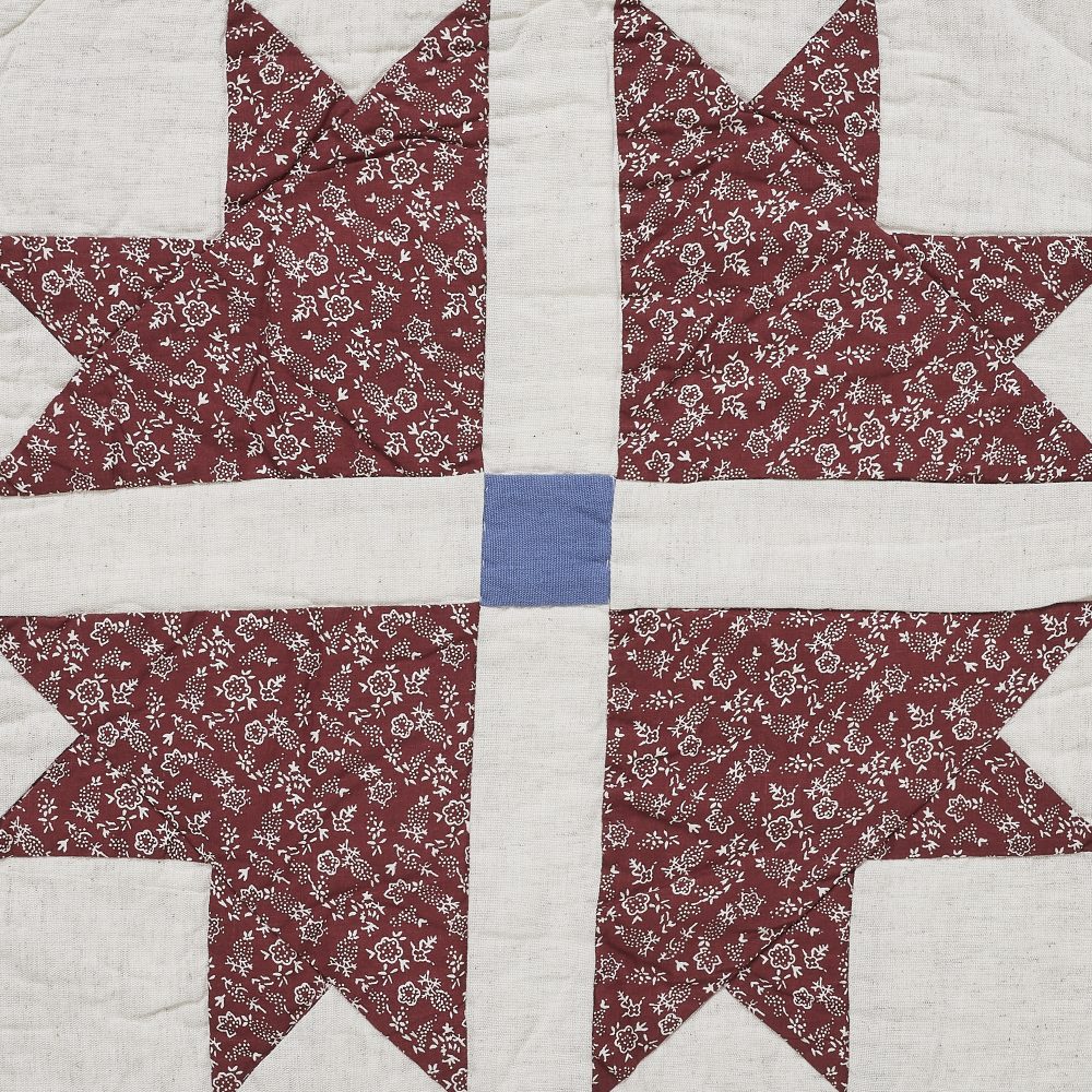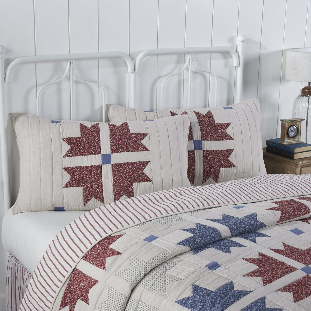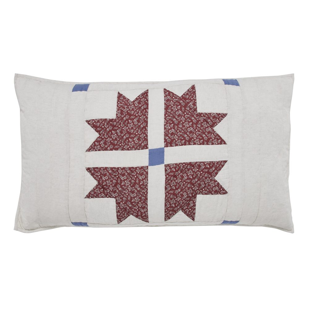 A timeless cross and crown quilt block pattern is given an patriotic update with this cozy Americana pillow sham. The Celebration King Sham 21x37 features a beautiful, classic star design in dusty blue and deep red on a soft creme base in a soft cotton linen blend. Backed by a barn red and soft creme ticking stripes with button-style closures. Coordinates with the Celebration Collection from VHC for a complete quilted Americana look.