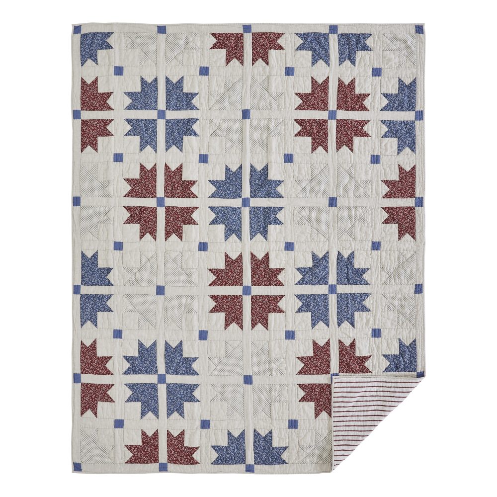 A timeless cross and crown quilt block pattern is given a patriotic update with this cozy American quilted bedspread. The Celebration Twin Quilt measures 68 by 86 inches and features a unique cotton-linen blend fabric for a cool, soft touch and superior durability. Hand quilted, the patchwork design features natural creme, dusty blue, and deep red colors. The cozy quilt reverses to a red and creme ticking stripe. Machine washable and iron safe. Coordinates with the Celebration Collection from VHC for a complete quilted Americana look.