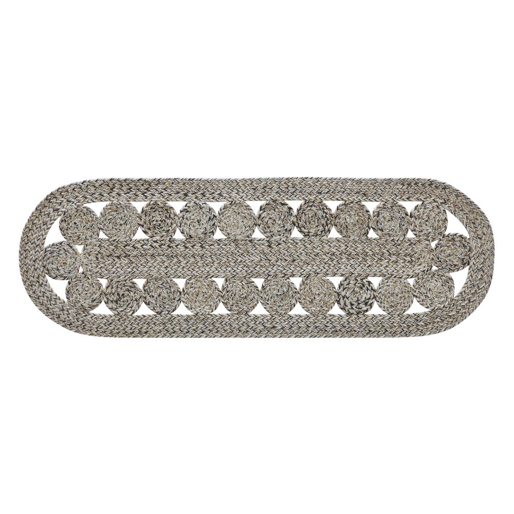Create a joyful table both inside and out for friends and family to gather round with earth-tone colors and a classic design. The Celeste Pebble Table Runner includes one table cover measuring 12x36 inches. The braided runner is made from recycled PET material for a water-resistant weave that can be used on traditional tabletops, or for sprucing up a patio table with farmhouse charm. Complete your tabletop decor with other pieces from the Celeste Collection by VHC for a classic woven design alternating rows and circles creating a timeless country farmhouse style.