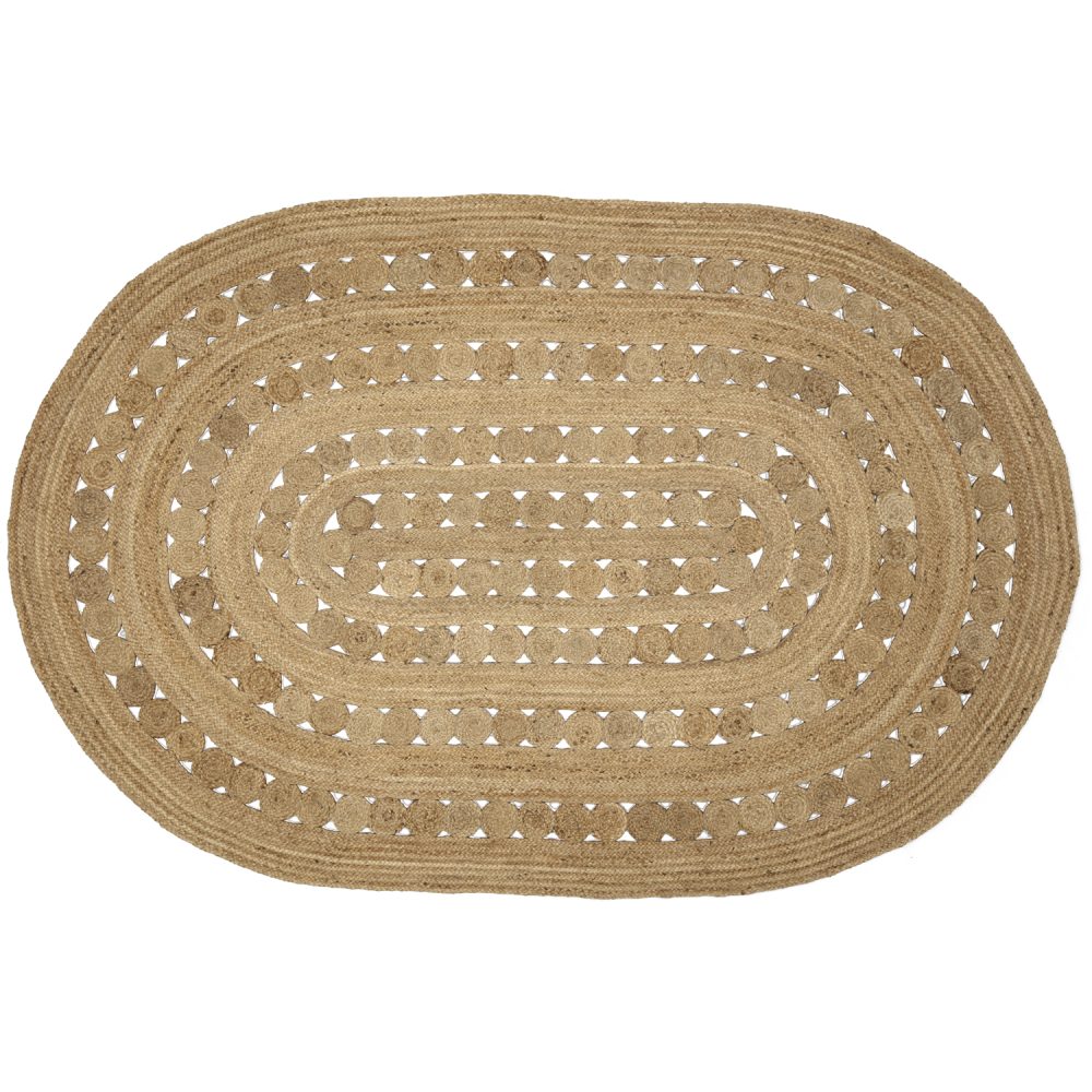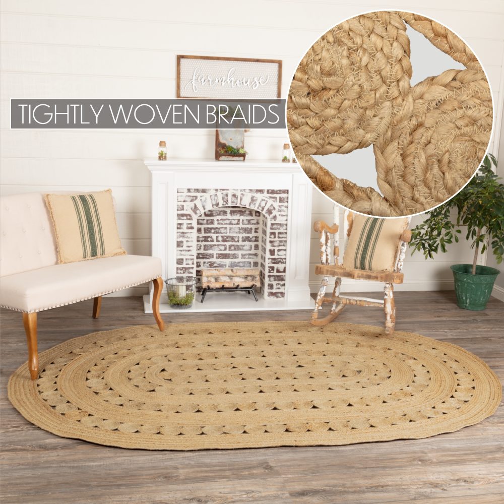 Create a warm, homey feeling with natural tones in pure Jute that add style anywhere an area rug is needed. The Celeste Jute Rug measures 72x108 inches and features a classic oval shape and tight braids constructed with 100% Jute. Features alternating rows of solid braids and small jute circles for a natural, rustic look that complements a wide array of farmhouse decor with rich texture and classic country charm. Reversible design features the same design on the front and back.