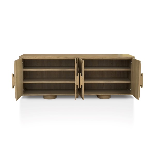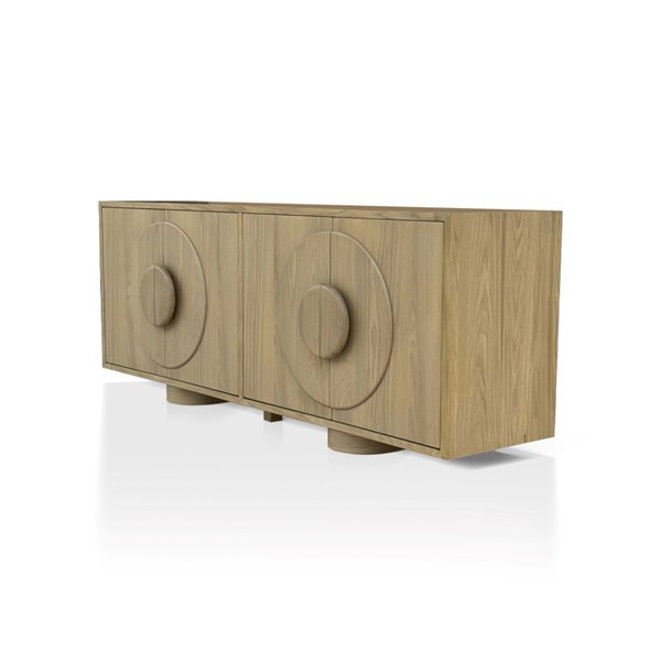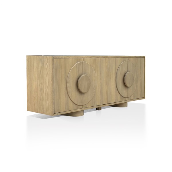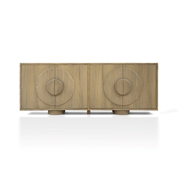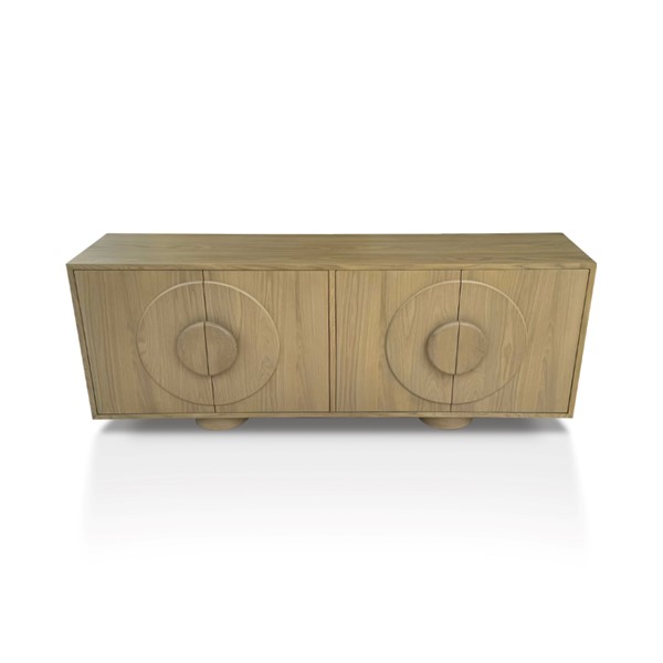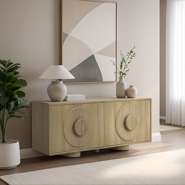 The Chapel Hill Armel Sideboard seamlessly blends sophistication with practicality, making a striking statement in any room. Its on-trend design features bold circular door details and pulls, paired with a unique base that adds an elegant touch. Inside, the sideboard offers two cabinets, each equipped with two adjustable shelves, providing ample storage for your essentials. Finished in a beautiful Light Oak stain with a durable seal on both the interior and exterior, this piece is as long lasting as it is stylish. Perfect as a sideboard, media unit, or entryway piece, the Armel Sideboard effortlessly complements a range of styles from classic contemporary to modern farmhouse, adding a refined, yet functional touch to your home.