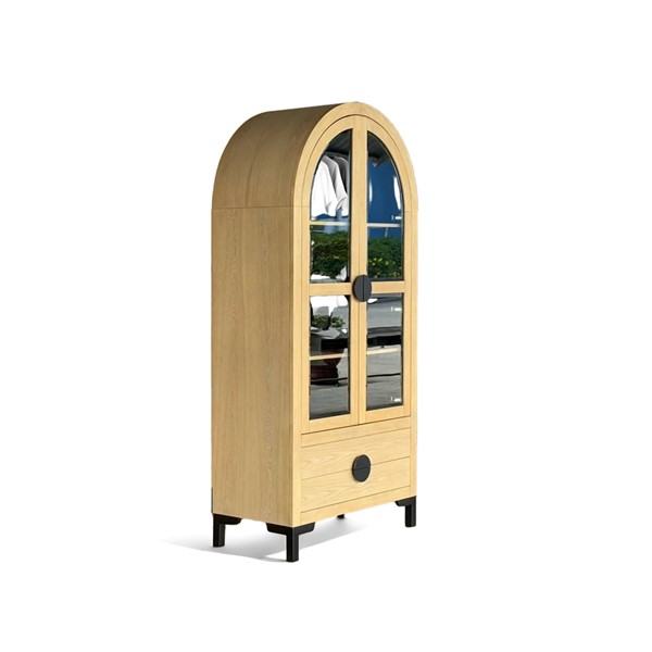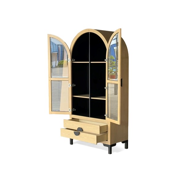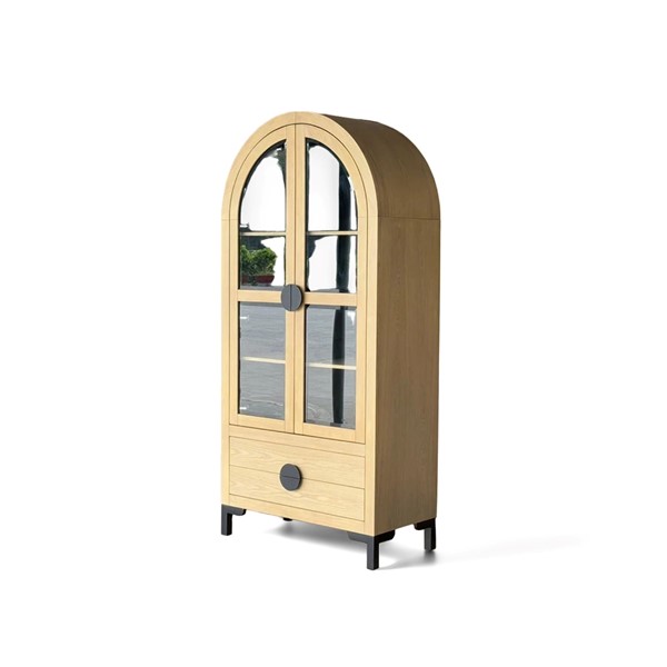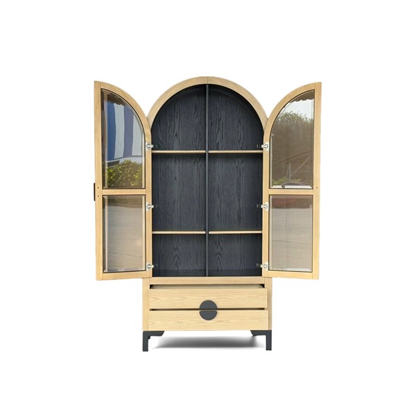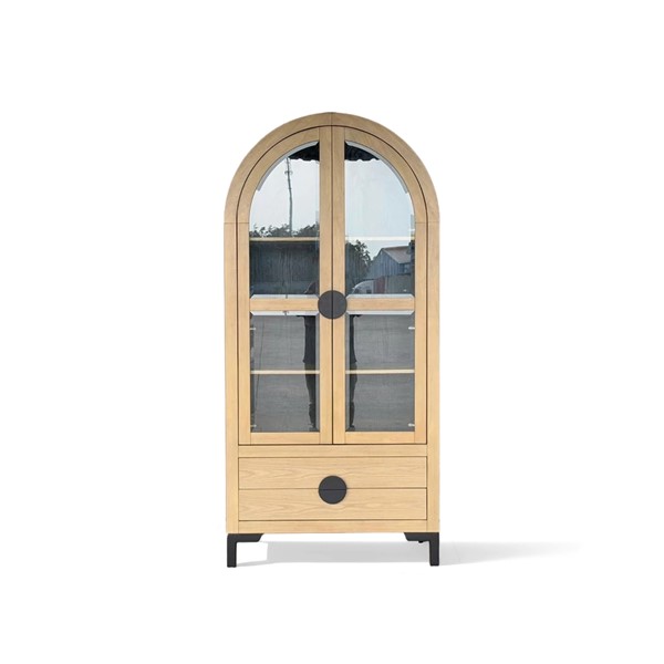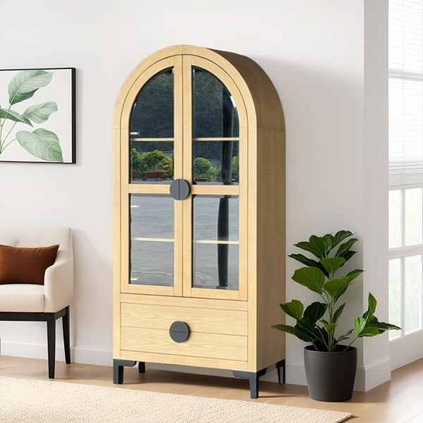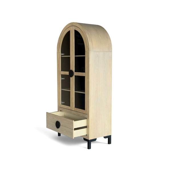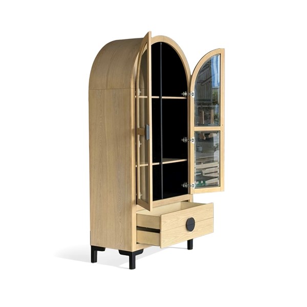 The Chapel Hill Remy Display Cabinet combines sophistication with practicality. It features tempered glass doors, three adjustable shelves, and two lower drawers for hidden storage. The Black Satin interior and Natural Oak exterior highlight the wood grain, while durable black steel legs add modern flair. Perfect for displaying your favorite items, this versatile piece suits living rooms, dining areas, entryways, or kitchens, and can be paired with our Remy sideboard to create a stylish media center.