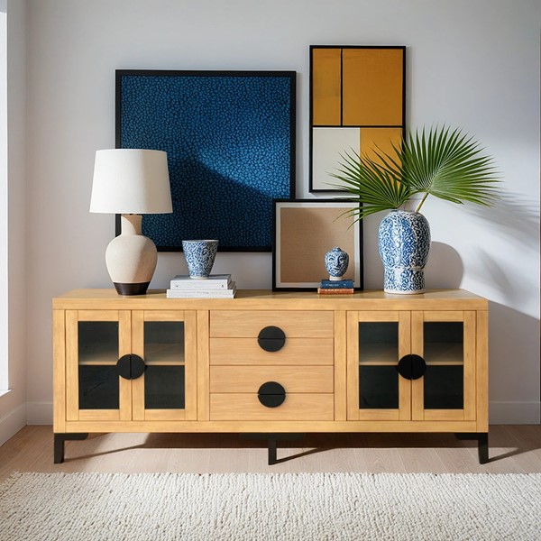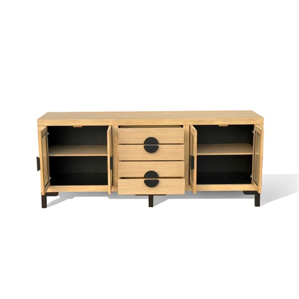 The Chapel Hill Remy Sideboard blends sophistication with practicality. It features two cabinets with tempered glass doors, an internal shelf, and four central drawers for hidden storage. The Black Satin interior contrasts beautifully with the Natural Oak exterior, highlighting the wood grain. With black steel legs, this versatile piece works as a sideboard, media unit, or entryway piece. Its design complements various styles, from classic contemporary to modern farmhouse, and pairs perfectly with the Remy Cabinet for a coordinated look.