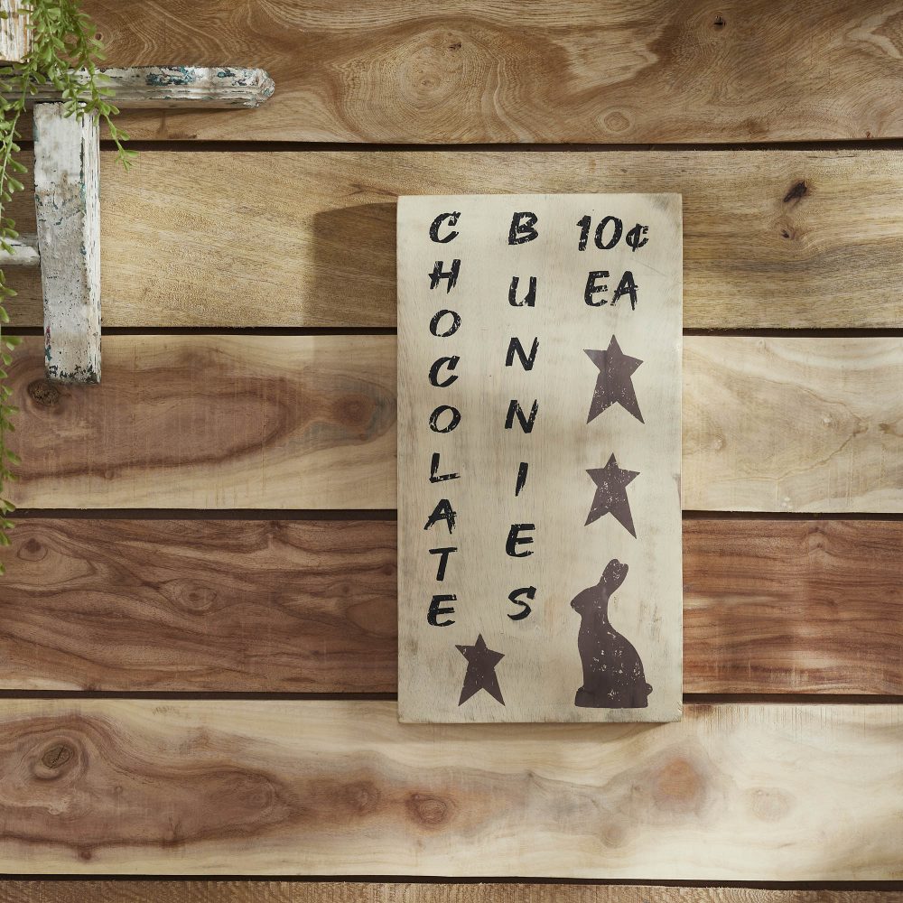 Introducing the VHC Brands Chocolate Bunnies Wooden Sign, a delightful addition to your Easter and spring decor. This 15x8-inch painted wooden sign, part of the Spring In Bloom Collection, brings a charming touch to your Dining Room, Entryway, or Living Room. Its elegant depiction of "Chocolate Bunnies .10 Each" against a backdrop of Light Tan infuses warmth and sophistication into your home. Crafted with meticulous detail, this rectangular sign captures the essence of the season, adding a playful yet refined accent to your space. The carefully painted depiction of chocolate bunnies embodies the spirit of Easter, making it a perfect complement for your home during this time of renewal. Its generous size ensures it stands out as a centerpiece on walls or serves as an elegant focal point on shelves, enhancing your existing decor effortlessly. Elevate your home with the festive spirit of Easter and the sophistication of spring using the VHC Brands Chocolate Bunnies Wooden Sign. Embrace the joyous energy with this delightful addition, invoking the sweetness of the season and the promise of delightful moments. Add a touch of whimsical elegance to your space, creating an inviting atmosphere perfect for gatherings and creating cherished memories with family and friends.