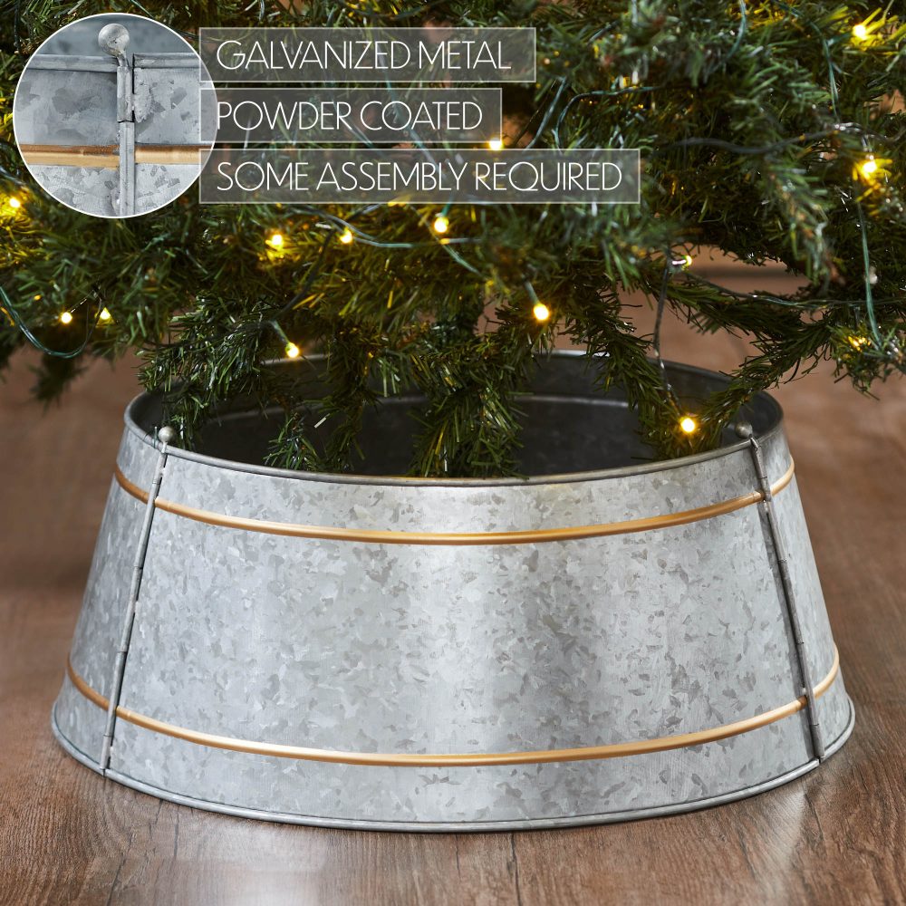 - Introducing the VHC Brands Metal Christmas Tree Collar in a charming Metal Grey finish, with brass gold accent bands, crafted to elevate your holiday decor with its primitive and rustic appeal.