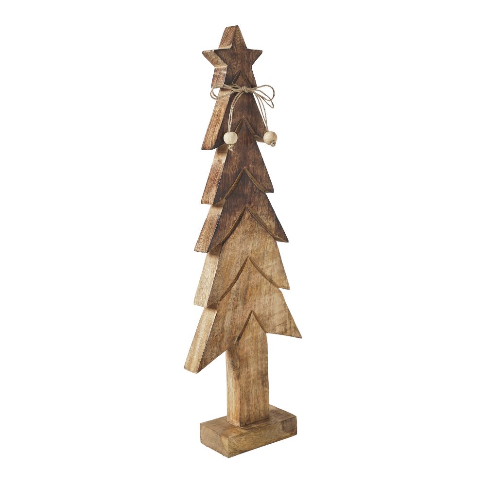 - Introducing our charming Tropical Wood Christmas Tree Figurine, a delightful addition to your winter and Christmas home decor, featuring a two-toned brown natural finish that exudes rustic elegance.
