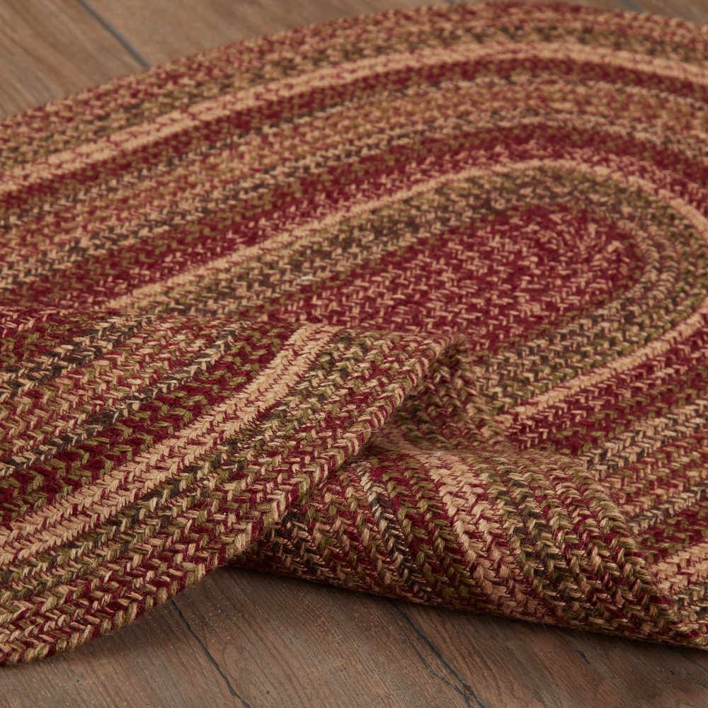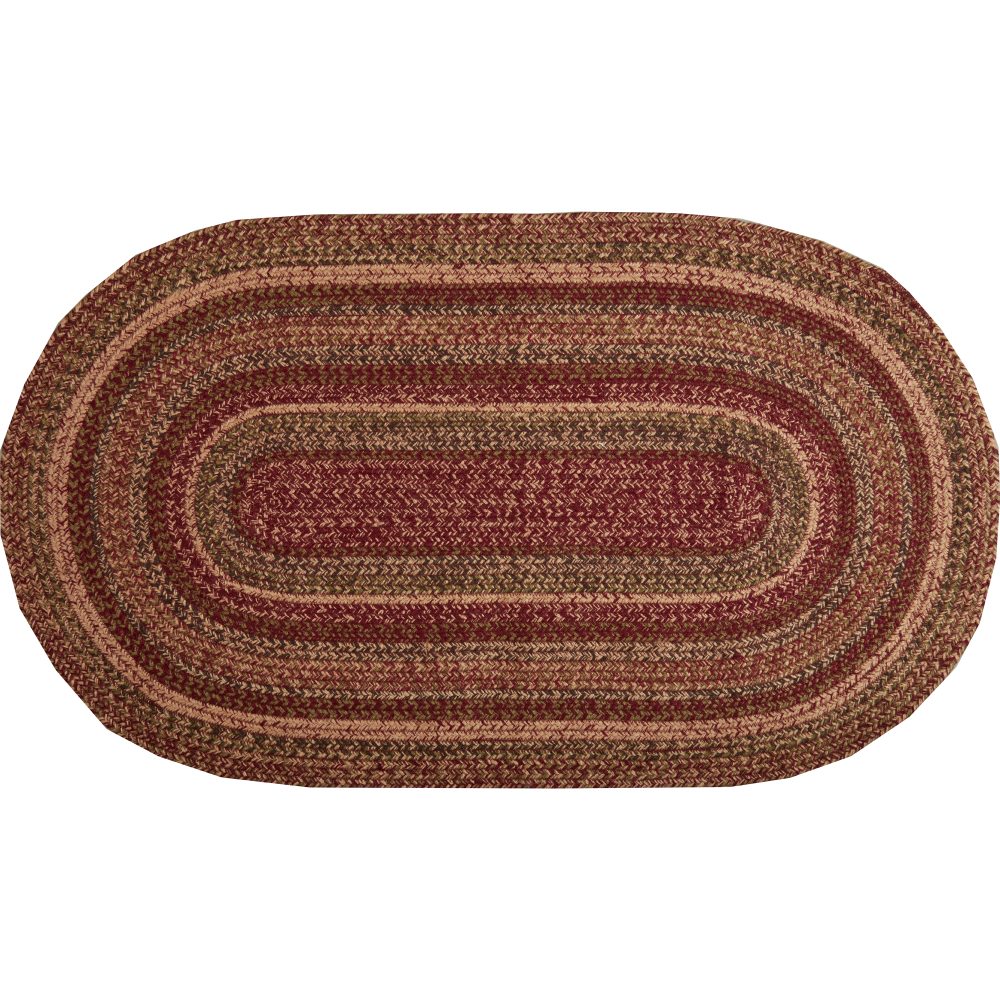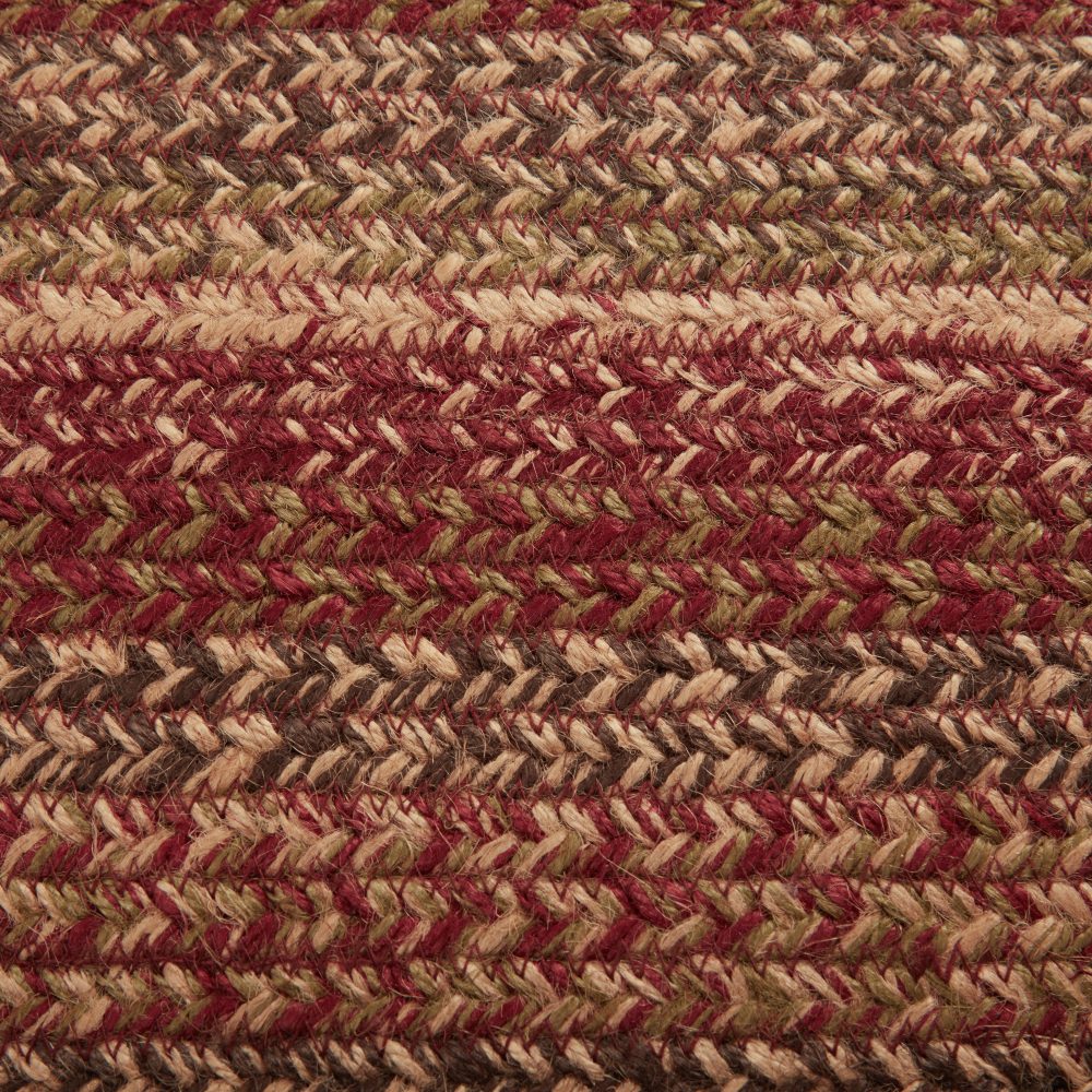 Create a warm, homey feeling with deep primitive colors in a curl-resistant jute blend that adds style and safety anywhere a mid-size accent rug is needed. The Cider Mill Jute Rug measures 27x48 inches and features a classic oval shape and tight braids constructed with a durable jute blend. The special blend relaxes faster and stays flat. The included PVC mat makes sure your beautifully braided jute rug stays exactly where it should. Features a blend of burgundy, tan and olive green for a dark, rustic look that complements a wide array of country farmhouse decor.