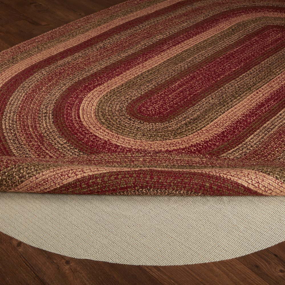 Create a warm, homey feeling with deep primitive colors in a curl-resistant jute blend that adds style and safety anywhere a versatile area rug is needed. The Cider Mill Jute Rug measures 60x96 inches and features a classic oval shape and tight braids constructed with a durable jute blend. The special blend relaxes faster and stays flat. The included PVC mat makes sure your beautifully braided jute rug stays exactly where it should. Features a blend of burgundy, tan and olive green for a dark, rustic look that complements a wide array of country farmhouse decor.