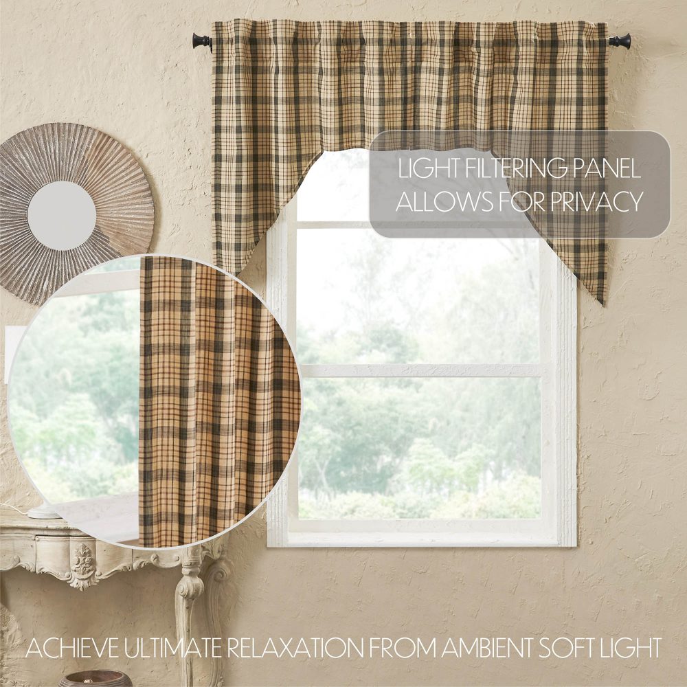 Decorate your windows with a touch of muted, rustic country style with this charmingly designed and thoughtfully crafted window swag set. Displaying a timeless country look with a calming, classic tartan plaid in khaki tan, forest green and russet brown, the Cider Mill Swag Set 36x36x16 enhances your home decor with a modern country feel. This 100% cotton curtain set includes two short swag-style panels with a white lining to prevent fading and provide additional privacy. It includes a rod pocket for easy hanging.