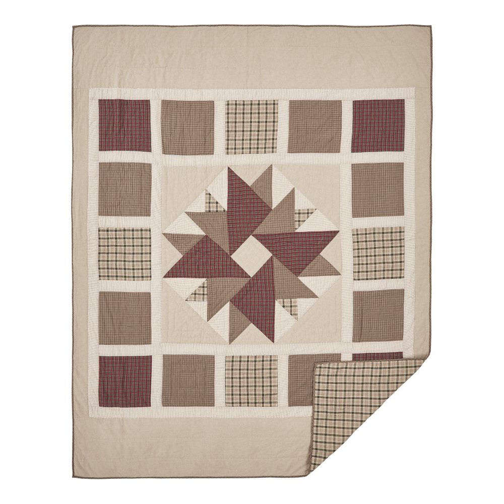 Add beautiful, primitive style to your bedding with a gorgeous star-style design with a simple block border. The Cider Mill Twin Quilt measures 68x86 inches and is constructed with 100 percent cotton. Khaki tan, barn red and forest green form muted plaid patterns that enhance the soft, comforting style of the bedspread. Reverses to a soothing tan plaid for alternate styling. Coordinates with the Cider Mill Collection by VHC for relaxed style and primitive country detailing for the whole home.