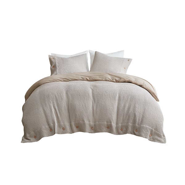The Clean Spaces Mara 3 Piece Cotton and Rayon from Bamboo Blend Waffle Weave Duvet Cover Set offers a cozy, casual update to your bedroom. This cotton and rayon from bamboo blend duvet cover features a waffle weave with button details, for a soft feel and textured look. The 2 matching shams pair handsomely with the taupe duvet cover to complete the modern bedding set. Oversized for extra comfort, this duvet cover set is machine washable for easy care and provides a farmhouse-inspired touch to your bedroom decor. An antimicrobial treatment provides built-in freshness protection, reducing the growth of odor causing bacteria to keep fabric lasting longer. A button closure at the foot end allows you to place a padded insert within the duvet cover and internal corner ties prevent it from shifting (Insert is NOT included).