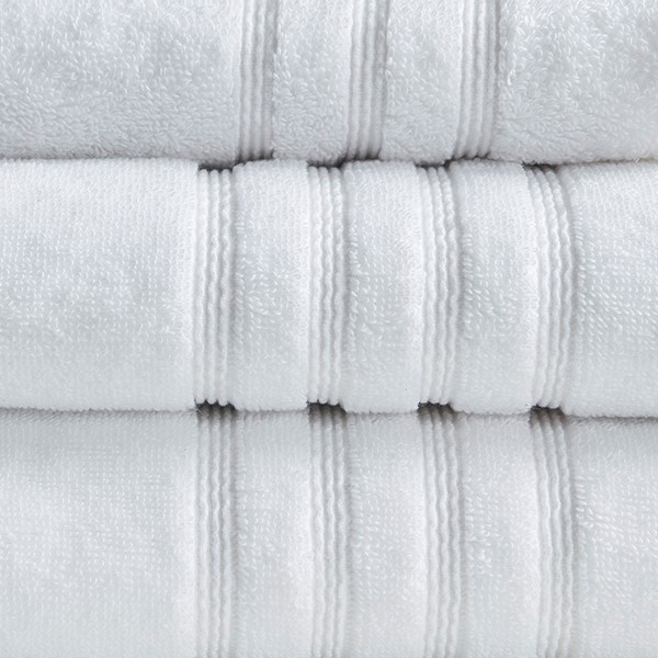 Complete your bathroom decor with our Clean Spaces Nurture Sustainable Antimicrobial 6PC Towel Set. This eco-friendly solid white towel set is made from regenerated cotton and recycled polyester fibers safeguarding our resources for a better carbon footprint, while still featuring a 650gsm quality weight for a soft and plush feel. Each towel is finished with SILVADUR(tm) antimicrobial treatment providing built in freshness protection, inhibiting growth of odor causing bacteria, and keeping linen newer, longer. Achieving the Made in Green by OEKO-TEX certified, meaning they do not include any harmful substances or chemicals while also using sustainable processes and socially responsible working conditions, for the best in quality comfort and wellness. Machine washable for easy care and active for multiple washes, this treatment delivers long-lasting durable odor protection performance, making it a superior addition to any bath time ritual. Set includes: 2 Bath (30″x54″), 2 Hand (16″x26″), and 2 Wash (12″x12″) towels.