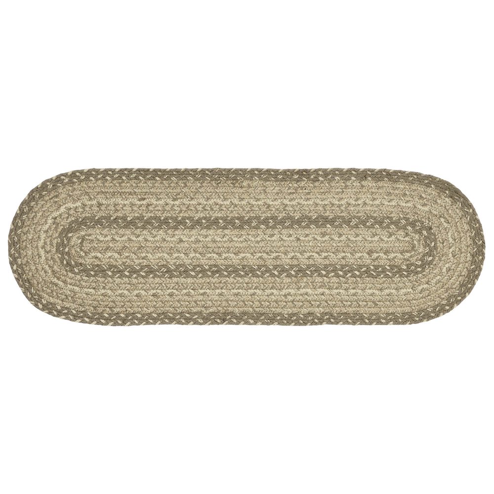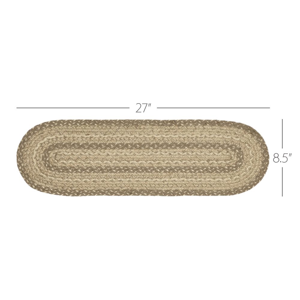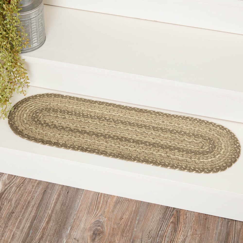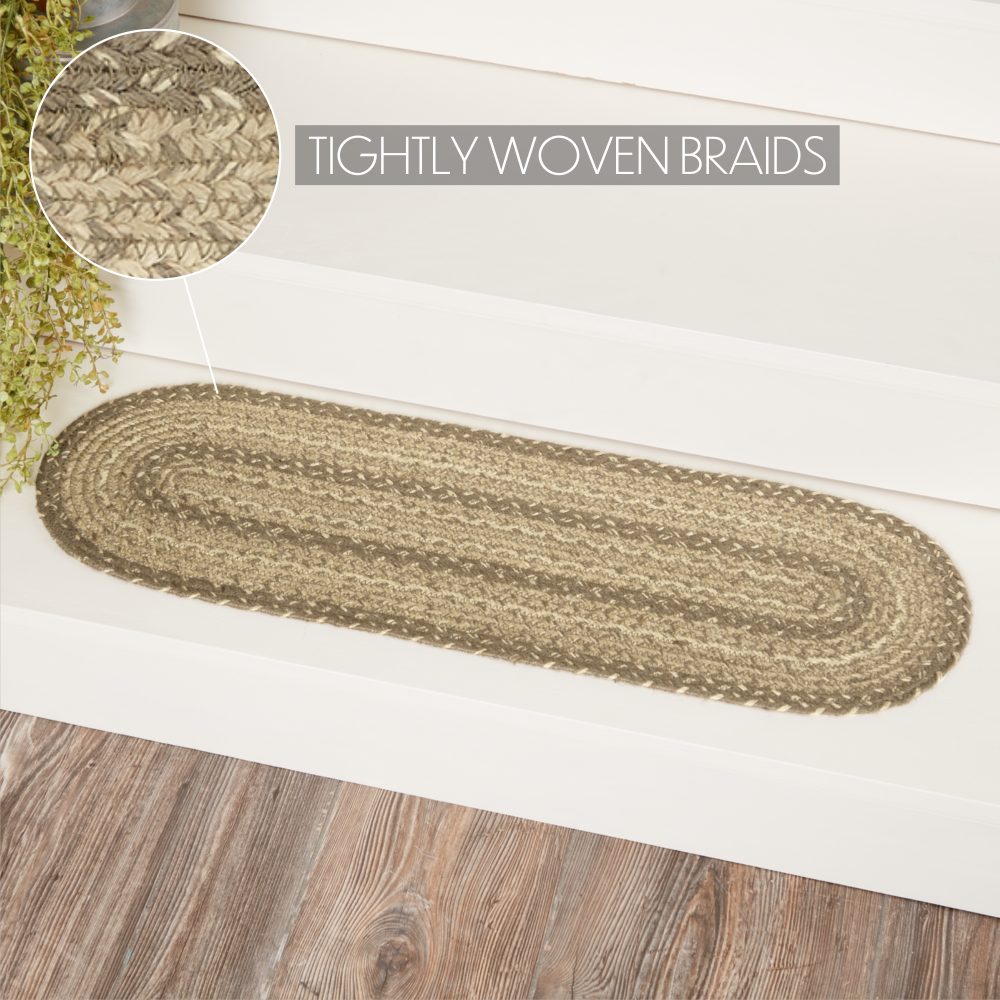 Protect stairways from damage and add style with braided jute in neutral, modern tones. The Cobblestone Jute Stair Tread Oval includes one 8.5x27 inch stair tread back by a latex spray to help prevent slipping. The low-profile jute features an innovative blend of 80 percent Jute and 20 percent cotton and other fibers to help the tread lay flat and resist creasing. This oval-shaped tread features a blend of khaki tan, grey taupe and creme braids for a soft, coastal cottage look. Coordinates with the Cobblestone Collection by VHC for a complete modern farmhouse set featuring rugs, kitchen accessories and more.