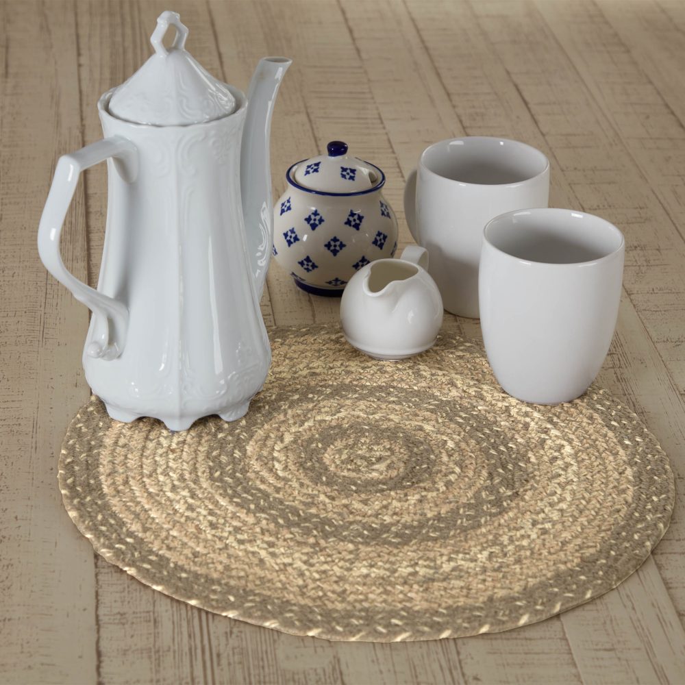 Who says trivets have to be boring? Protect counters and tables from hot pans and dishes with modern color and classic texture. The Cobblestone Jute Trivet includes one circular trivet with a 15-inch diameter made from a premium Jute blend. The rich texture of braided jute is given a modern farmhouse twist with soft tan, taupe and creme tones for a casual country cottage style. Complete your tabletop decor with other pieces from the Cobblestone Collection by VHC for modern farmhouse style.