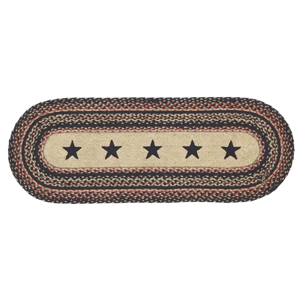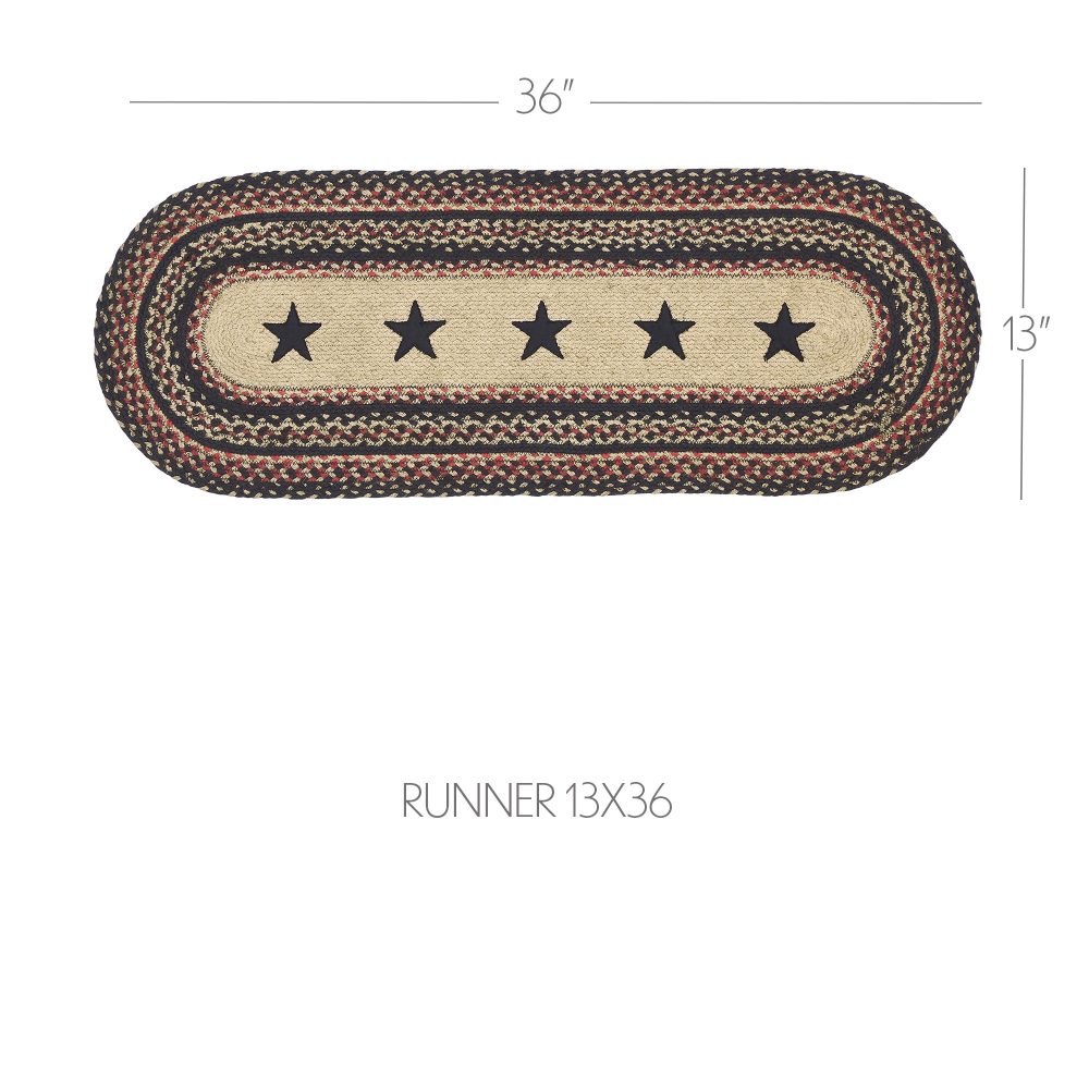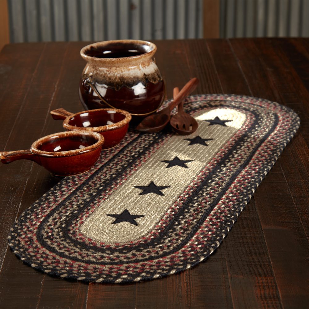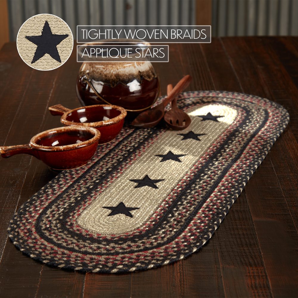 Create a cozy and casual table for friends and family to gather round with traditional colors and classic texture. The Colonial Star Jute Runner includes one oval table runner measuring 13x36 inches made from a premium Jute blend. The rich texture of braided jute is given a primitive feel with a natural tan base infused with rows of country black and bright red that frame a central applique design of five point stars. Complete your tabletop decor with other pieces from the Colonial Star Jute Collection by VHC for modern primitive style.