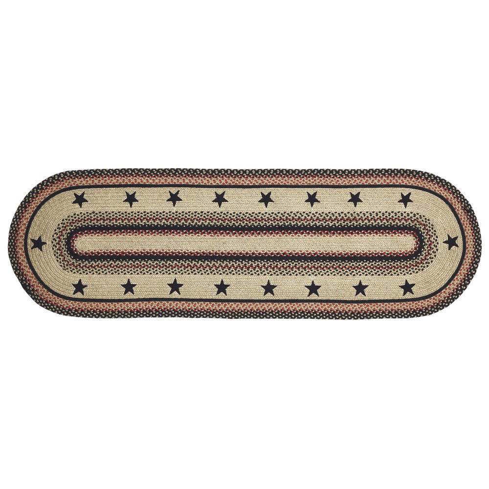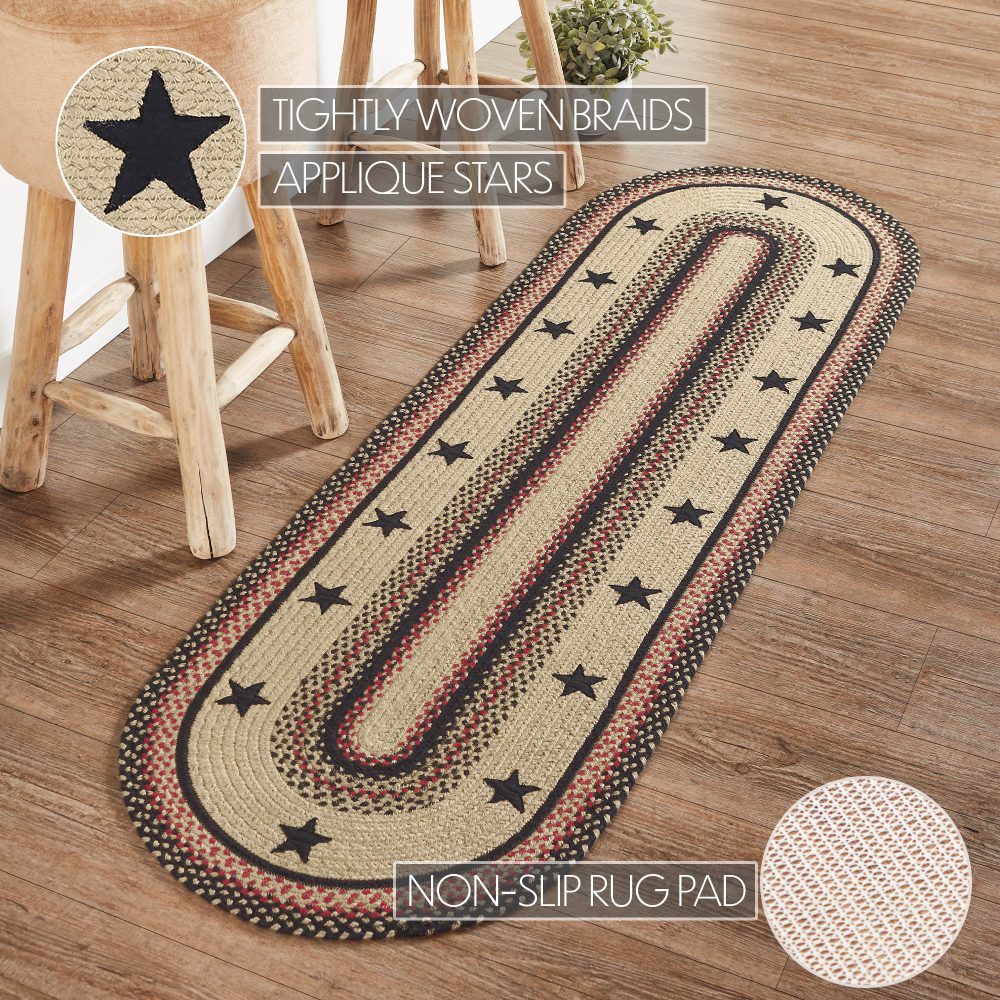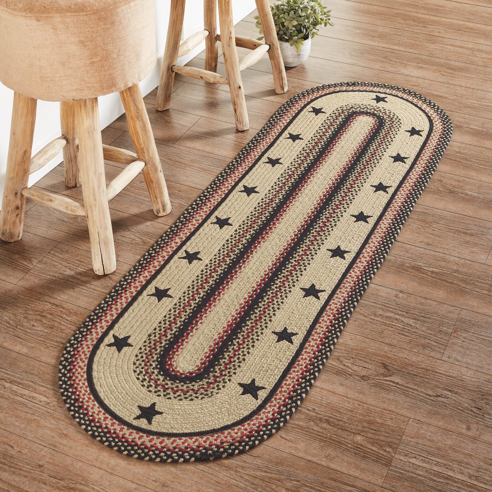 Create a warm, homey feeling with classic country colors and bold black stars in a curl-resistant jute blend that adds style and safety anywhere a long runner style rug is needed. The Colonial Star Jute Runner measures 22x72 inches and features a classic oval shape and tight braids constructed with a durable jute blend. The special blend relaxes faster and stays flat. The included PVC mat makes sure your beautifully braided jute rug stays exactly where it should. Features a blend of country black, natural tan, and bright red for a timeless look that complements a wide array of country farmhouse and primitive decor.
