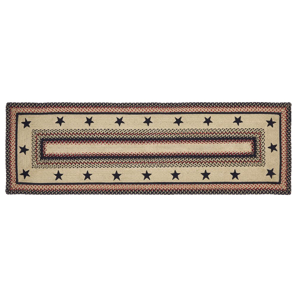 Create a warm, homey feeling with classic country colors and bold black stars in a curl-resistant jute blend that adds style and safety anywhere a long runner style rug is needed. The Colonial Star Jute Runner measures 22x72 inches and features a classic rectangle shape and tight braids constructed with a durable jute blend. The special blend relaxes faster and stays flat. The included PVC mat makes sure your beautifully braided jute rug stays exactly where it should. Features a blend of country black, natural tan, and bright red for a timeless look that complements a wide array of country farmhouse and primitive decor.