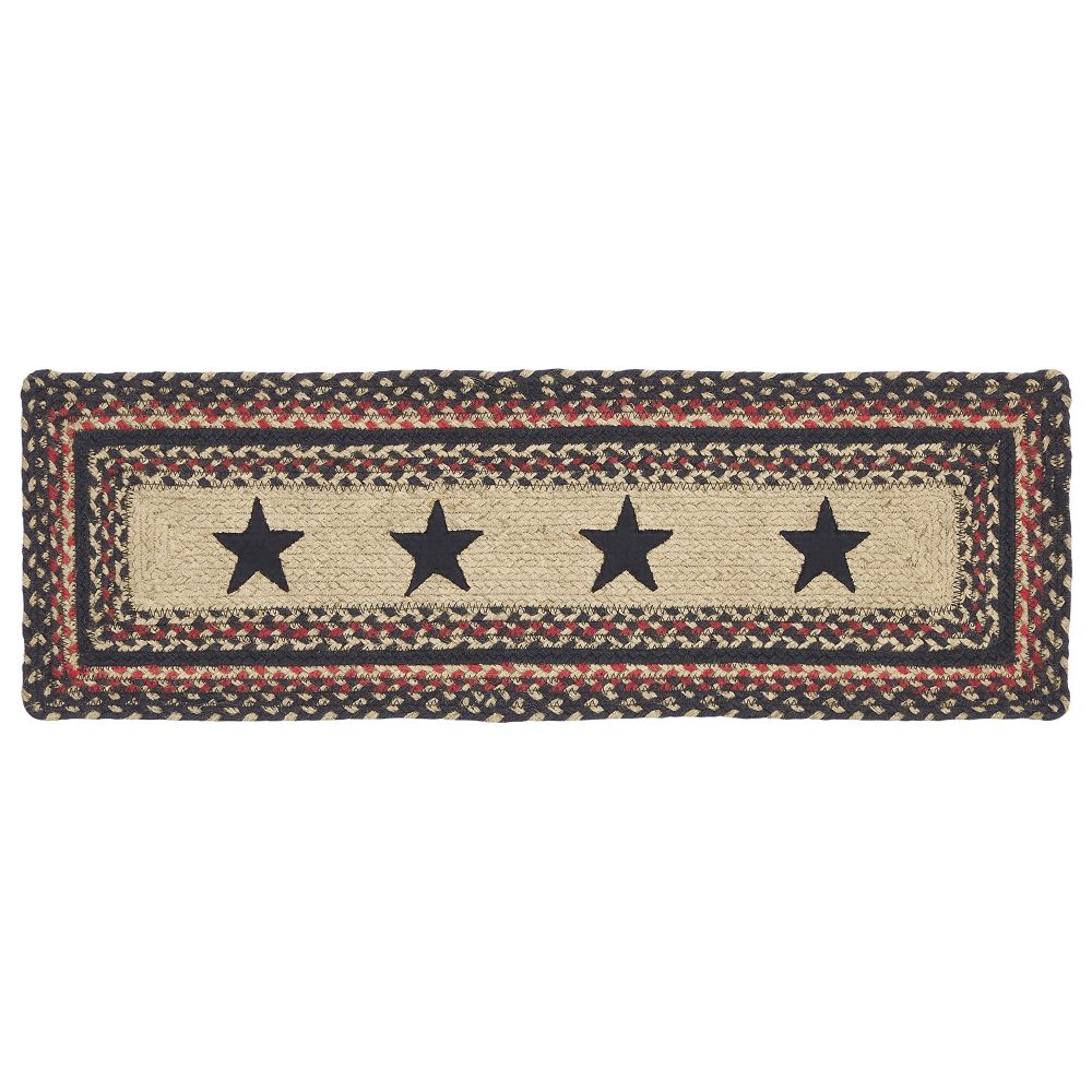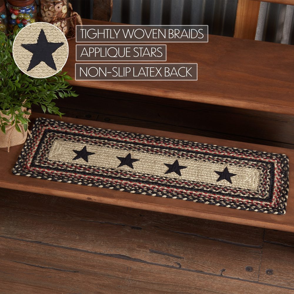 Protect stairways from damage and add style with braided jute in bold, traditional tones. The Colonial Star Jute Stair Tread Rectangle includes one 8.5x27 inch stair tread back by a latex spray to help prevent slipping. The low-profile jute features an innovative blend of 80 percent Jute and 20 percent cotton and other fibers to help the tread lay flat and resist creasing. This rectangle-shaped tread features a blend of natural tan, country black, and bright red braids framing a row of five-point stars for a classic country look. Coordinates with the Colonial Star Collection by VHC for a complete modern primitive set featuring rugs, kitchen accessories and more.