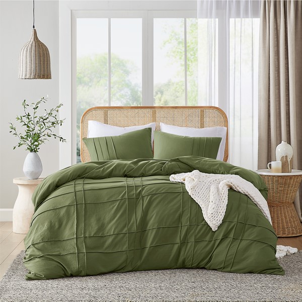 Comfort Spaces Walker Soft Washed Pleated Duvet Cover Set in Olive Green, Full AM12-0438