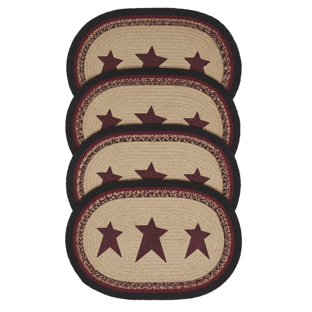 Elevate your dining decor with the VHC Brands Braided Cotton Placemat Set of 4 from the Connell Collection. These oval placemats in rich burgundy, adorned with stenciled stars, exude primitive charm and country elegance. Crafted from high-quality recycled cotton with a textured braided design, these placemats are ideal for both indoor and outdoor use, making them perfect for family dinners, Thanksgiving gatherings, or cozy fall meals. Each set includes four 13x19-inch placemats, providing ample space for your dinner plates and enhancing your table's aesthetics. The rich burgundy hue with stenciled stars creates a warm and inviting atmosphere, making these mats perfect for fall and Thanksgiving table settings. Whether you're hosting a formal dinner or a relaxed meal, these mats offer versatility and style. Elevate your dining experience with the Connell Collection Braided Recycled Cotton Placemat Set, adding a touch of rustic elegance to your meals. Not only do these placemats enhance your dining experience with their charming design, but they also offer ease of maintenance, allowing you to spend more time enjoying your meals and less time cleaning up. With their durable construction and timeless appeal, the Connell Collection Braided Cotton Placemats are a must-have addition to your dining room or kitchen, where primitive charm meets modern functionality. Transform your table setting with these burgundy beauties and create memorable dining moments.
