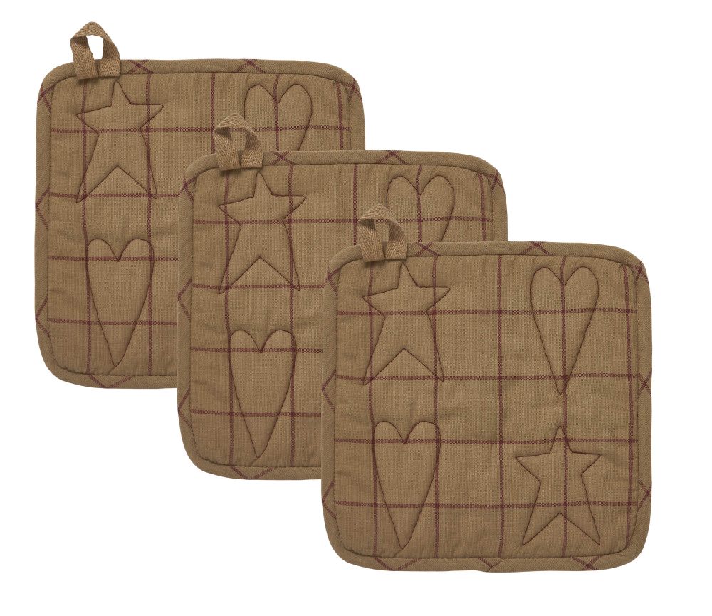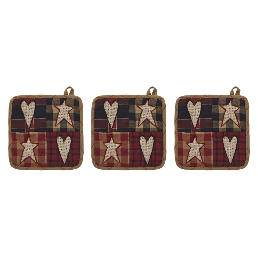- Primitive Country Style: Embrace the primitive country style with the VHC Brands Cotton Patchwork Pot Holder Set of 3 from the Connell Collection, adding warmth to your kitchen decor.